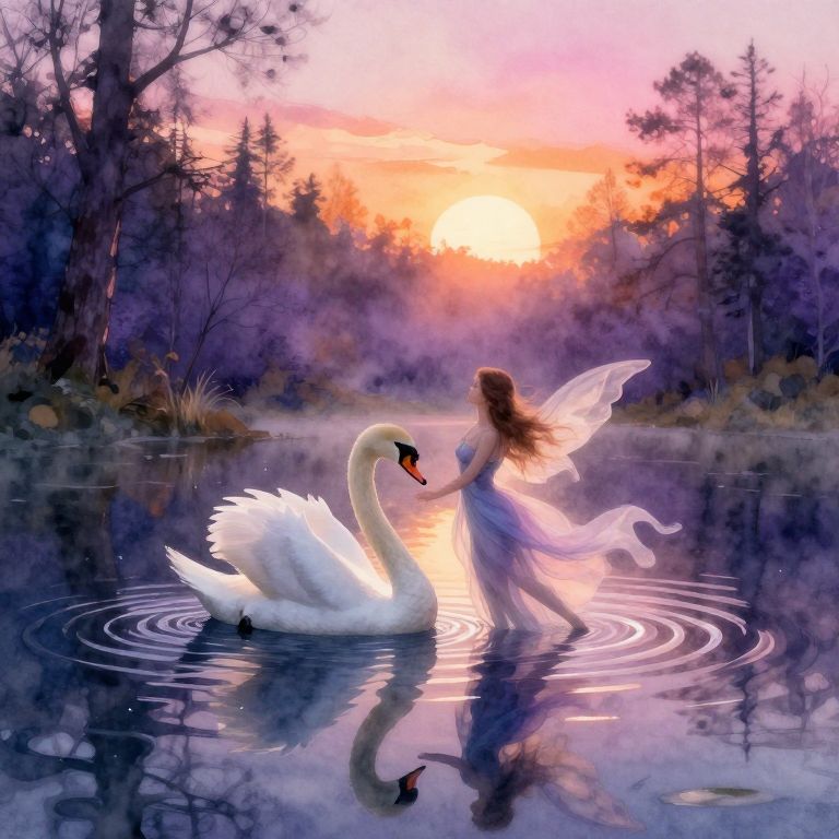 Imagine an enchanting landscape bathed in the soft light reminiscent of watercolor paintings, with a mysterious atmosphere captured from a unique perspective. In this captivating scene, a graceful swan and an ethereal nymph engage in an underwater dance, their movements creating mesmerizing ripples that shimmer like jewels on the pond's surface. The background reveals a vibrant forest at dawn, transitioning from deep purples to soft oranges and pinks as the sun begins to rise, casting a warm glow over the tranquil scene. This tableau evokes a sense of wonder, tranquility, and enchantment, inviting viewers to immerse themselves in the delicate interplay between nature's beauty and the mysterious allure of an unseen realm.