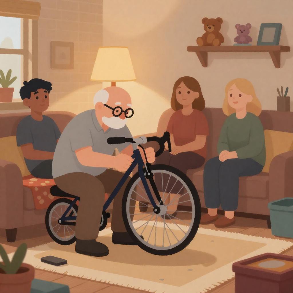 Digital illustration of an older man with glasses and a bald head repairing a bicycle wheel inside a warm, cluttered living room. Three people with different hairstyles and casual clothing sit on a couch in the background, observing. The room features a brick wall, a lit lamp, shelves with toys, and a cozy atmosphere.