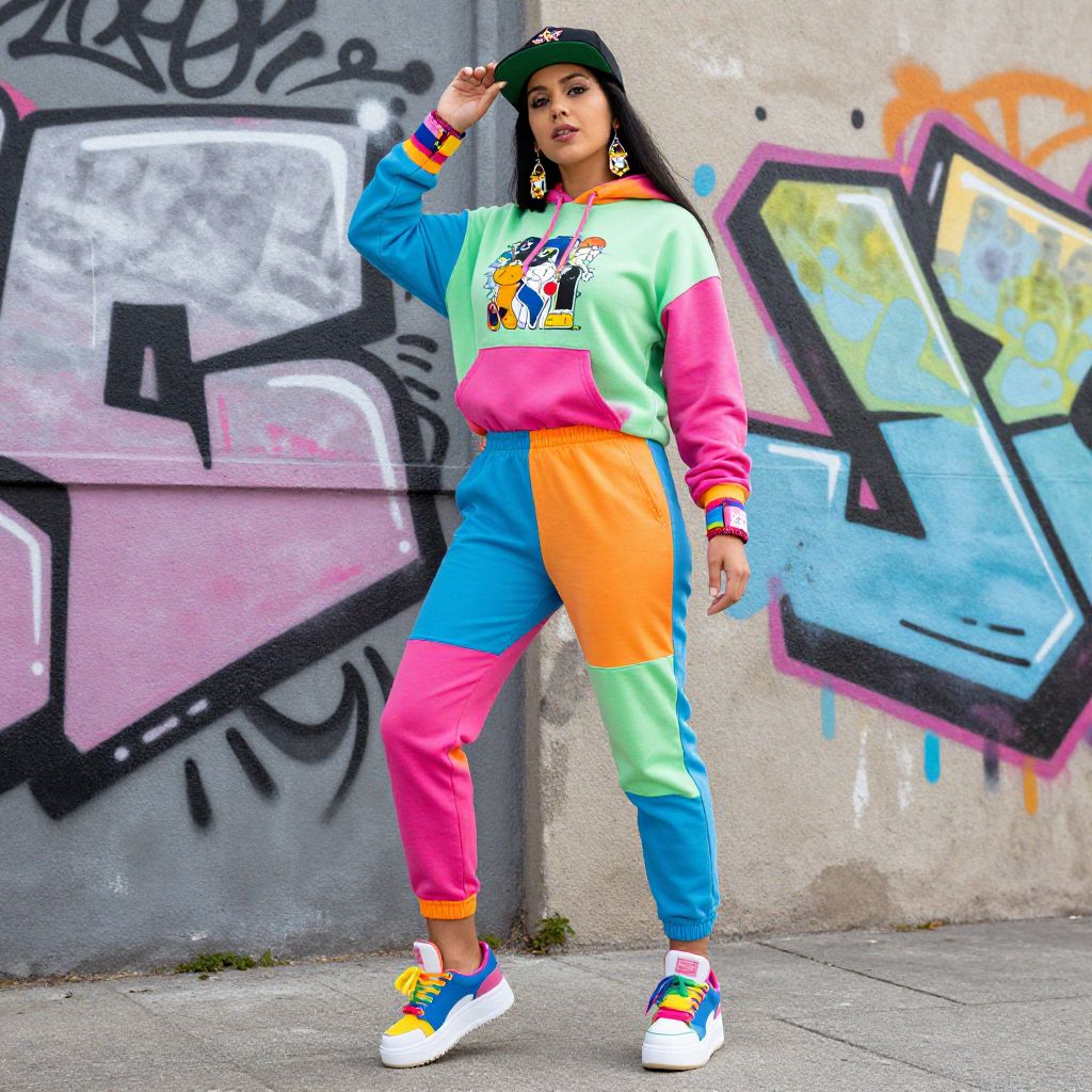 Photograph of a young woman standing outdoors against a graffiti-covered concrete wall. She has long black hair and wears a black baseball cap, large hoop earrings, a colorful, oversized hoodie with pink, blue, orange, and green panels, and matching pants. Her white sneakers with yellow and blue accents add contrast. She poses with one hand on her cap and the other by her side, exuding confidence. The graffiti includes bold, multicolored tags and shapes, enhancing the urban, vibrant atmosphere. The sidewalk beneath her is gray and slightly worn.
