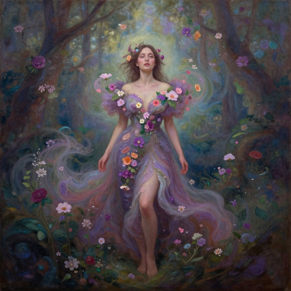 Digital painting of two dancing fairies in pastel dresses, one pink, one blue, standing on a shirtless man's chest in a vibrant,