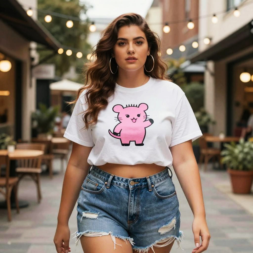 A lanky woman in casual streetwear, wearing a white cropped t-shirt with a pink cartoon graphic and frayed denim shorts, large gold hoop earrings, standing under string lights in a city courtyard, visual style: a1 pictures. Sexy. Pretty face and beutiful eyes