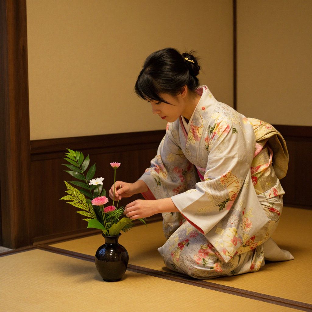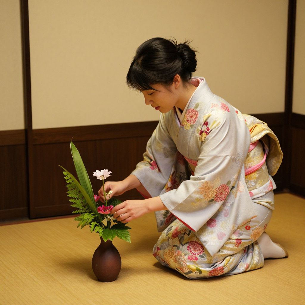 Japanese woman in floral kimono kneels on tatami mat, arranging flowers in brown vase, traditional wooden wall background. Photograph.