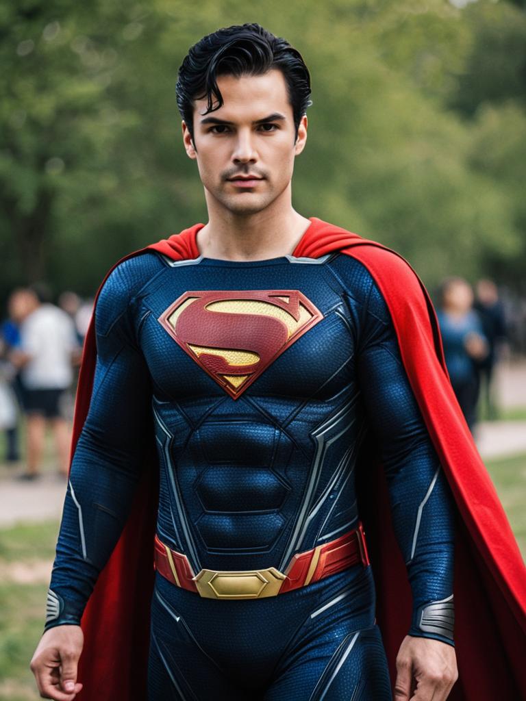 A young man dressed as a superhero in a blue suit with a red cape stands confidently in the foreground, with three other men in superhero costumes blurred in the background. The main subject wears black boots, a gold-buckled belt, and has short hair. The scene is outdoors with a natural, slightly blurred background.