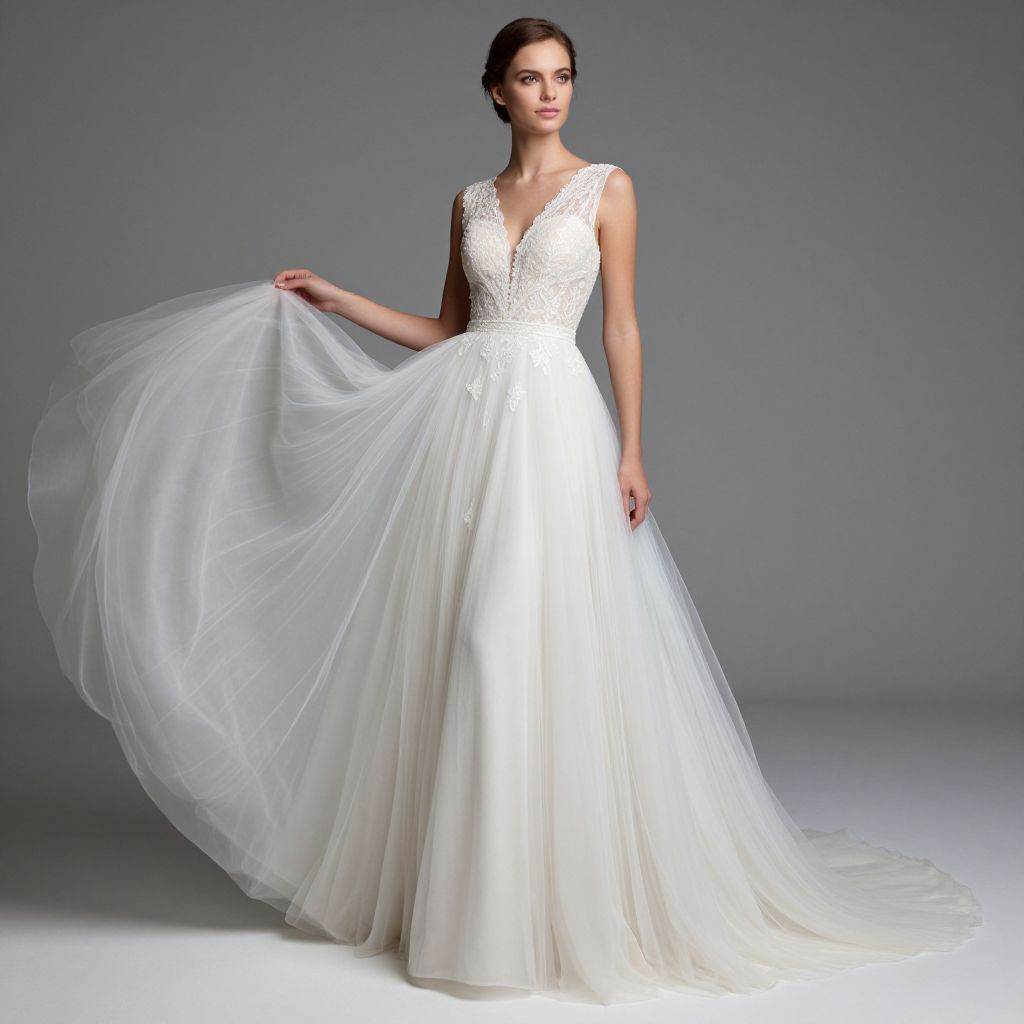 Photograph of a slender, fair-skinned woman with dark hair in an elegant updo, wearing a white, full-length wedding gown with a lace bodice and short sleeves. The gown features a fitted waist and a voluminous, tulle skirt that flows gracefully. She stands against a plain, gray background, looking directly at the camera with a subtle smile. The lace texture on the bodice contrasts with the soft, sheer tulle of the skirt, creating a delicate, ethereal look. The lighting is soft, highlighting the dress's intricate details and the model's serene expression.