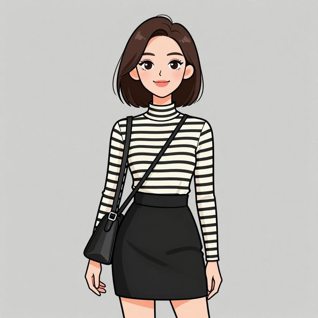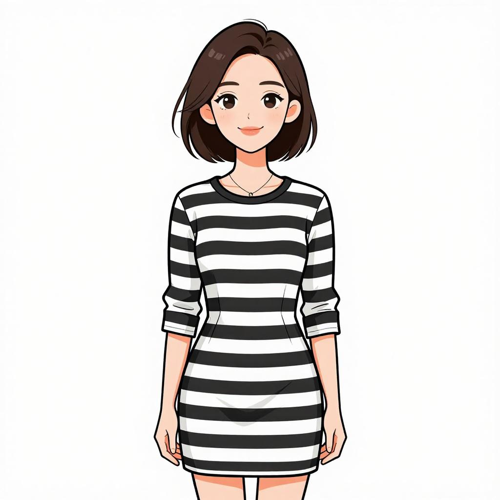 This digital illustration in a clean, anime-style features a young woman with fair skin, large dark eyes, and a short, straight black bob haircut. She wears a black and white horizontal striped, three-quarter sleeve dress that reaches mid-thigh. The dress has a simple, casual design with no visible patterns or embellishments. She stands against a plain white background, with a slight, friendly smile on her face. The illustration uses bold black outlines and solid colors, emphasizing a modern, minimalist aesthetic.