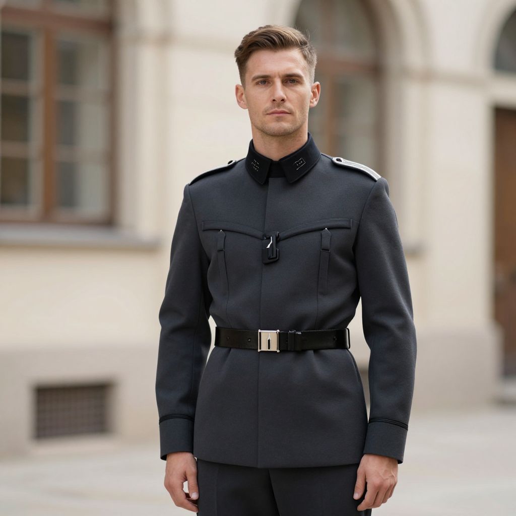 Europe Costume Man, dressed in a military uniform standing in front of a building
