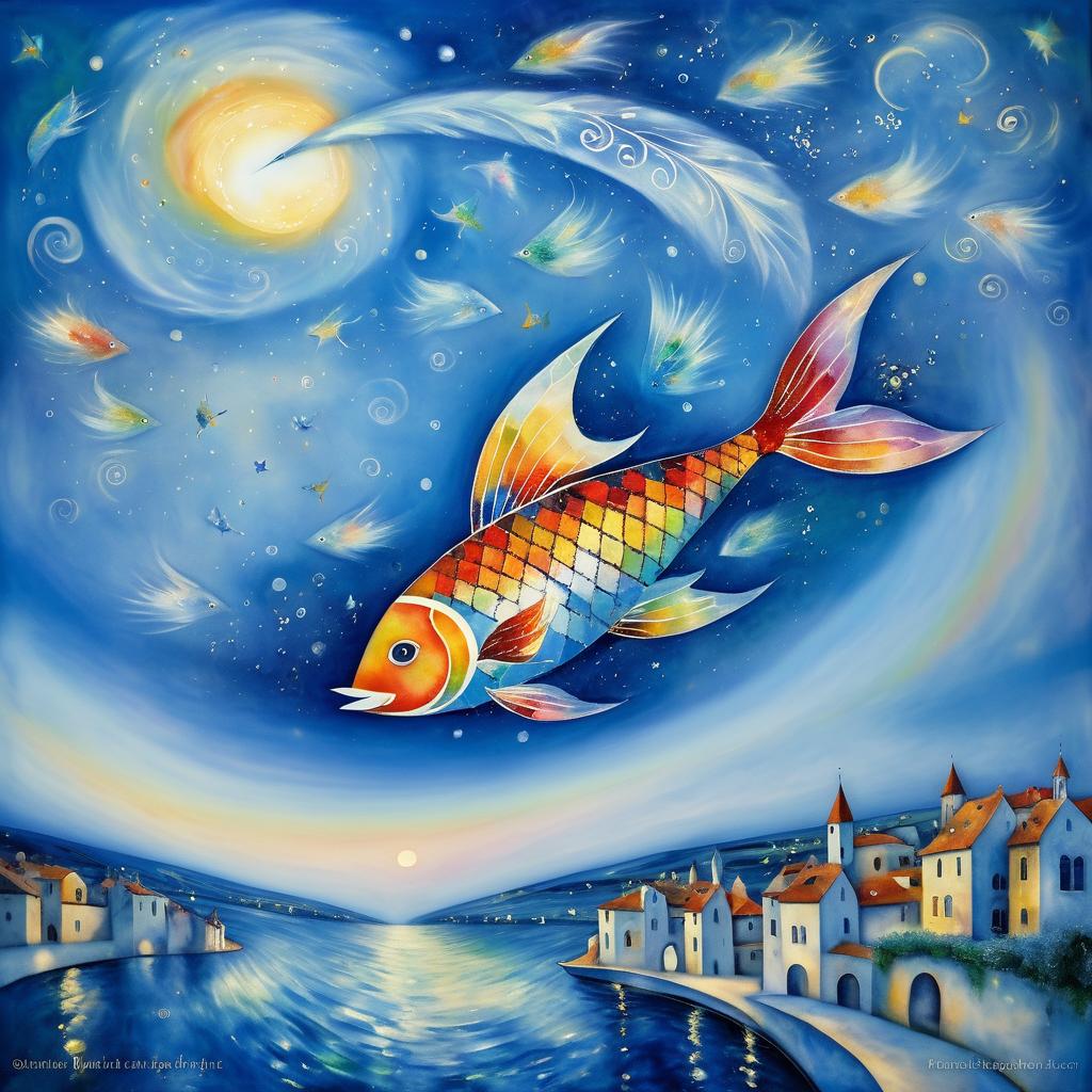 A colorful, surreal painting inspired by Marc Chagall featuring a large, multicolored fish flying over a serene river town at dusk. The sky is filled with smaller ethereal fish and soft swirling patterns, illuminated in a Renaissance-style lighting that emphasizes vivid blue tones and glowing highlights. The river reflects the mystical light from the sky, creating a magical atmosphere.