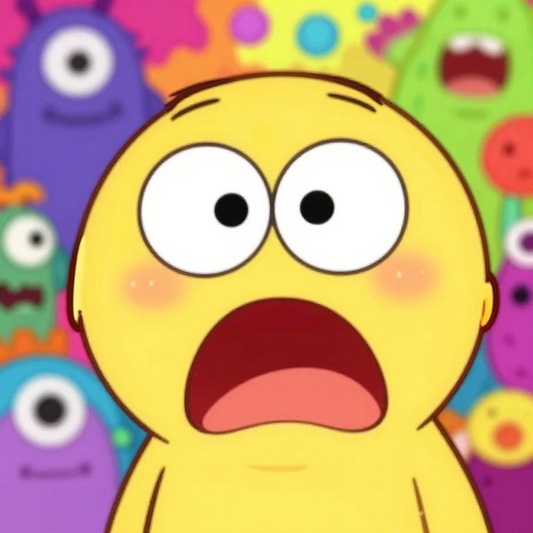 Cartoon character showing horrified expression, exaggerated wide eyes and drooping mouth, vibrant colors, chaotic background with monsters, dynamic and playful illustration