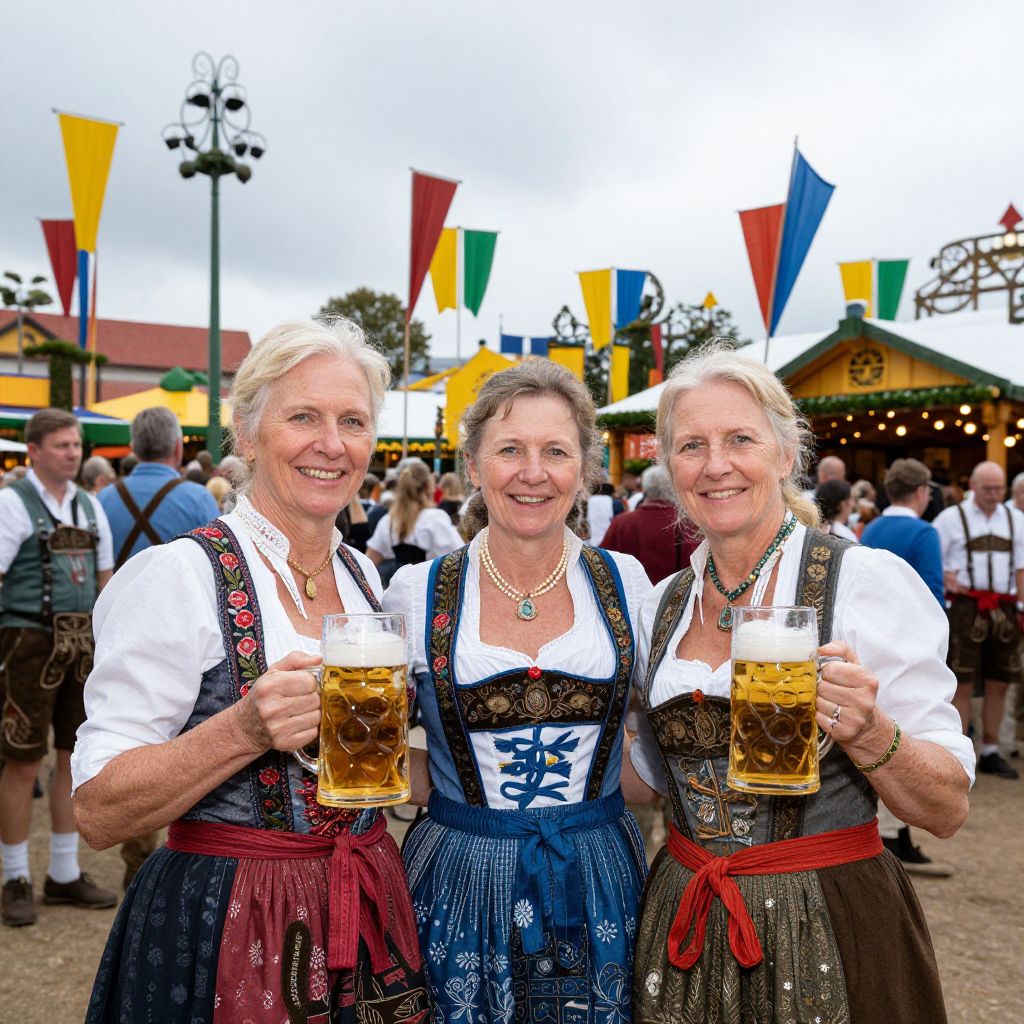 Three smiling elderly women in traditional Bavarian dirndls, holding beer mugs, stand at an outdoor Oktoberfest festival with colorful flags.
