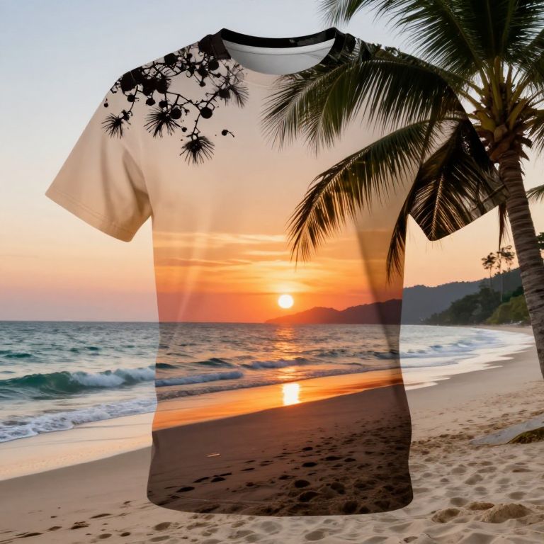 Photograph of a white T-shirt with palm tree and sunset graphic, hanging on a tropical beach at sunset, with ocean waves and palm trees in the