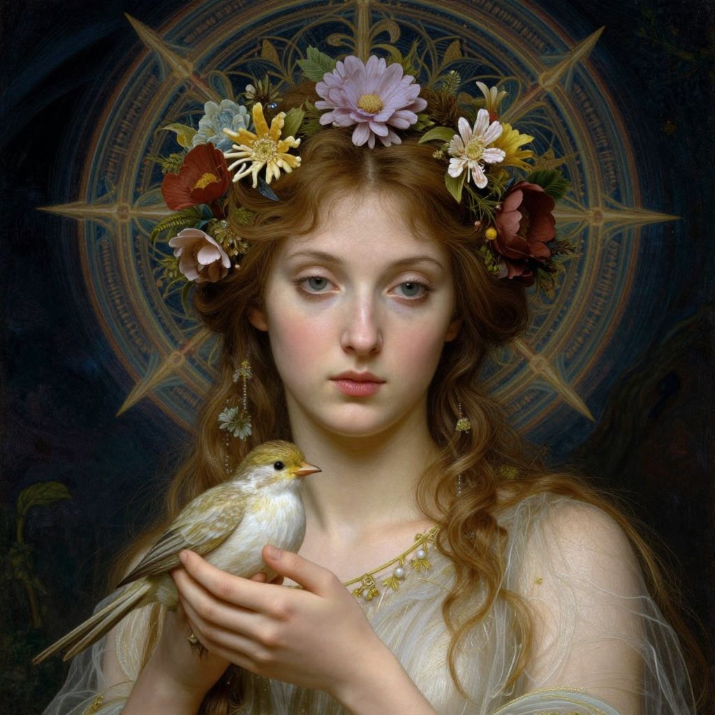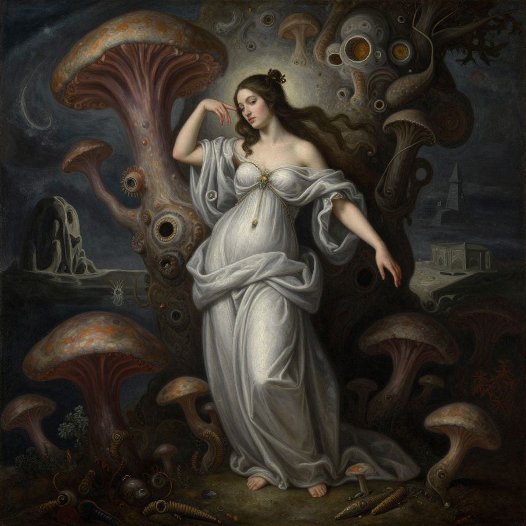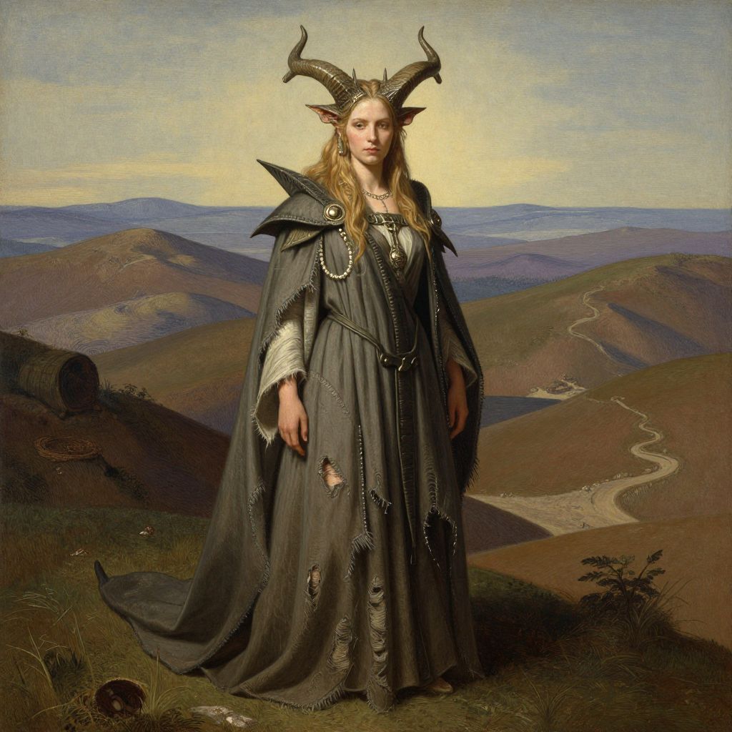 Classical painting of a young woman with deer antlers, white draped gown, golden headband, and armlet, against a forest sunset.