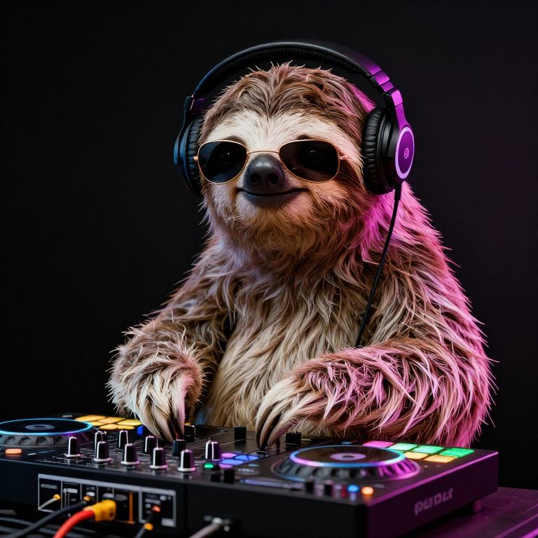 A sloth DJ wearing sunglasses and headphones, operating a mixing board with vibrant neon colors and a black background.