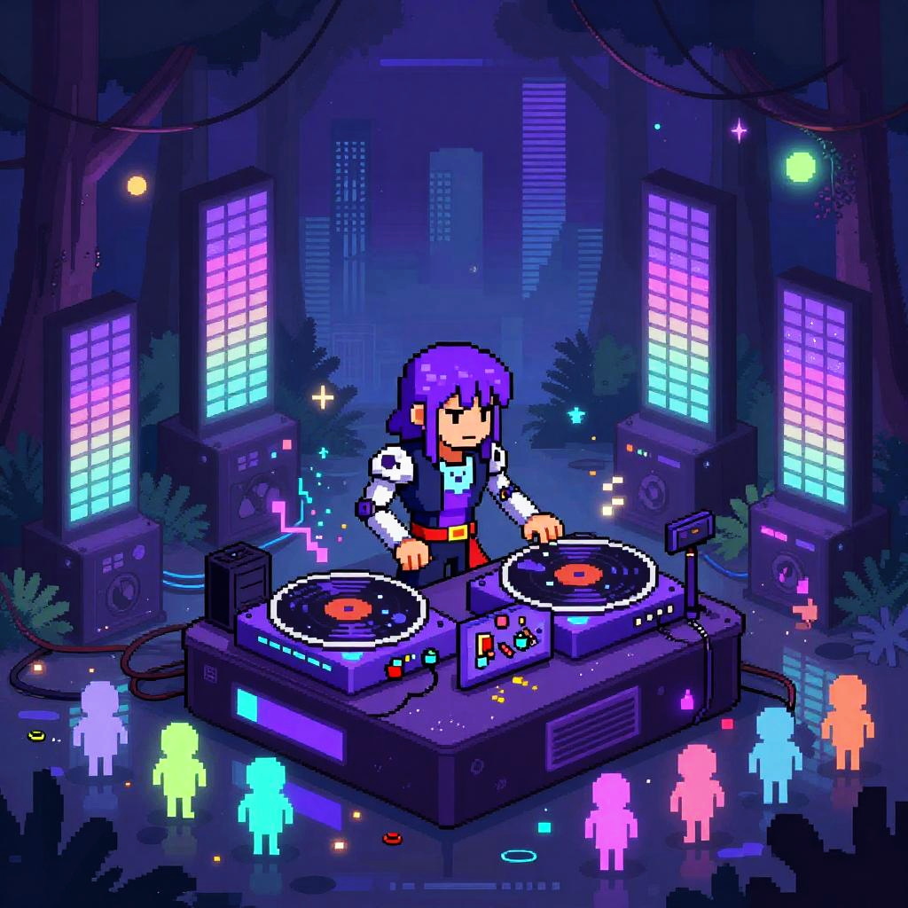 Pixel art image depicting a red-haired person with a blue shirt and black pants, playing a red electric guitar while DJing with two turntables and a mixer. The scene is set against a neon-lit background with colorful, vertical LED bars in pink, green, and blue. The DJ stands on a glowing purple platform surrounded by glowing blue humanoid figures. The image has a futuristic, retro-futuristic style with digital interface elements in the top left and bottom right corners. The overall color palette is dark with vibrant neon accents.
