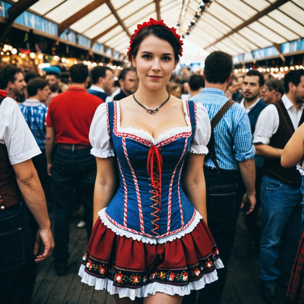 Oktoberfest Corset Dress, woman in a red and blue dress standing in a crowded area
