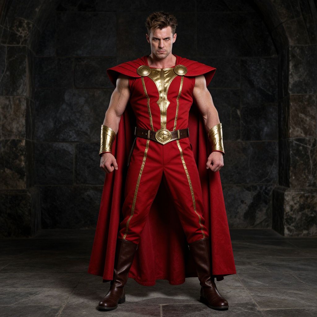 Photograph of a muscular white man with short brown hair, standing confidently in a dark, stone-walled setting. He wears a vibrant red superhero costume with gold accents, including a high-collared cape, gold chest emblem, and matching gold armbands. The costume features vertical gold stripes on the chest and pants, with a black belt and brown boots. His stern expression and squared stance exude power and determination. The red fabric contrasts sharply with the dark background, highlighting his strong, defined physique. The lighting emphasizes the textures of the costume and his muscular build.