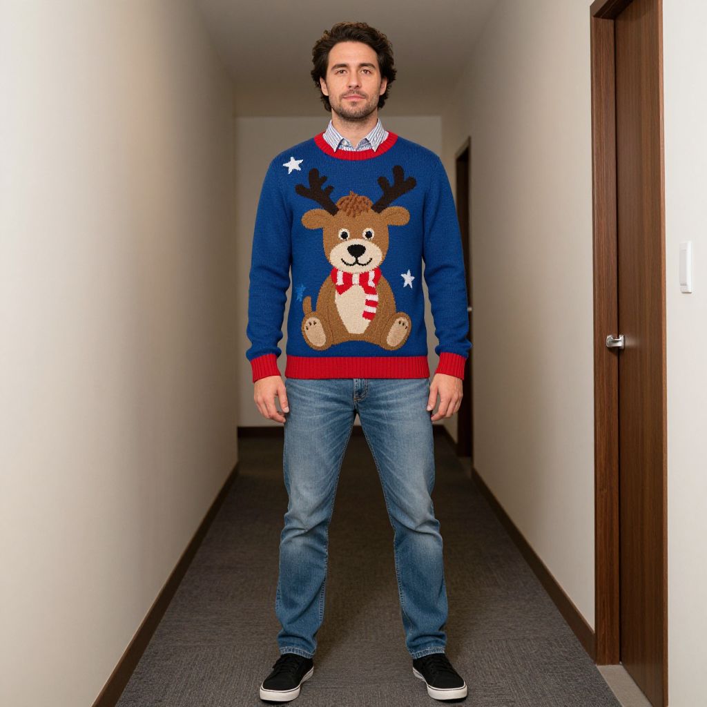 Photograph of a white man with curly black hair and a trimmed beard standing in a narrow, carpeted hallway with white walls and wooden doors. He wears a blue Christmas sweater featuring a cartoon reindeer with antlers, red scarf, and white stars on the sleeves. The sweater has a red collar and cuffs. He pairs the sweater with blue jeans and black sneakers. The man stands centered in the hallway, looking directly at the camera with a neutral expression. The image has a humorous, slightly surreal quality due to the contrast between the festive sweater and the mundane hallway setting.