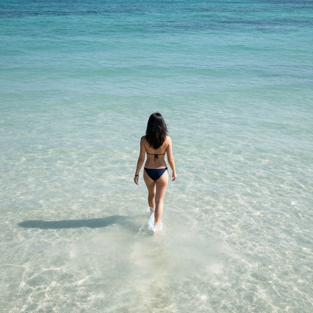 Photograph of a woman with long black hair in a black bikini walking away from the camera in clear, shallow ocean water.