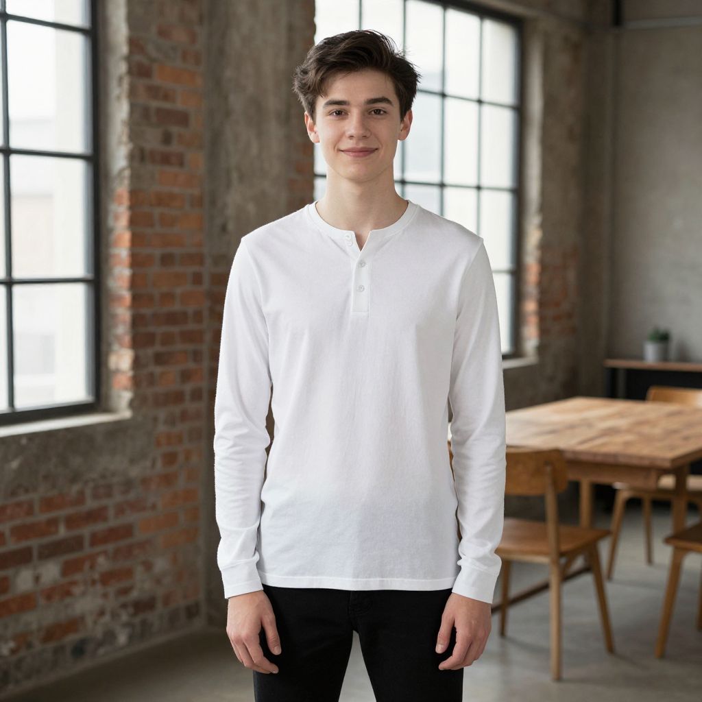 Photograph of a young man with short brown hair, wearing a white long-sleeve henley shirt and black pants, standing in a rustic loft