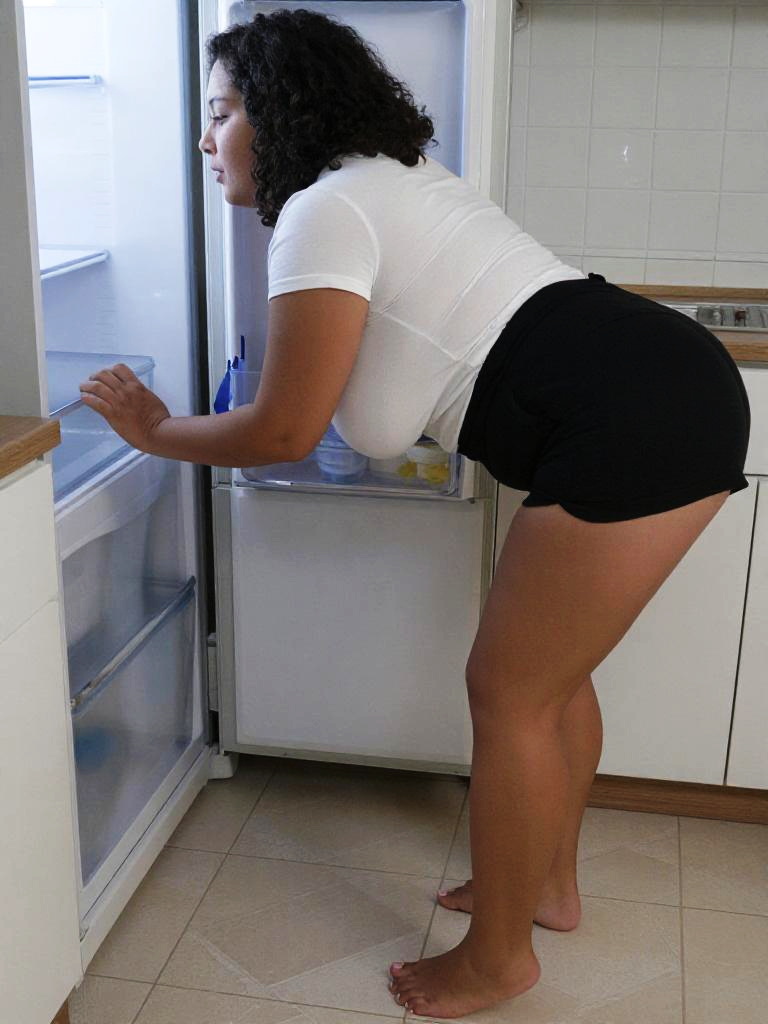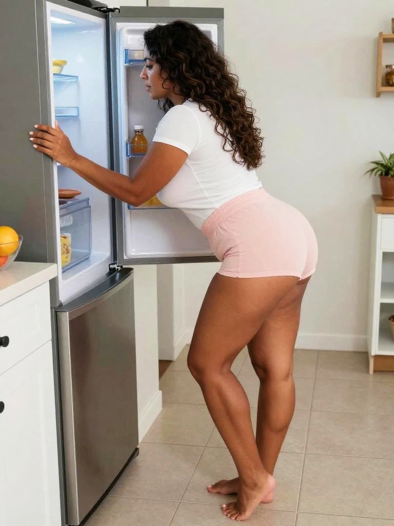 Casual home scene, redhead with loose bun, huge tits, bending slightly and reaching into an open refrigerator in a bright kitchen, wearing a fitted royal blue t-shirt and high-waisted soft lavender shorts, bare feet on tiled floor, natural ambient indoor lighting, everyday domestic setting with fruit bowl on the counter, candid lifestyle photography, high resolution ###mystic:1###