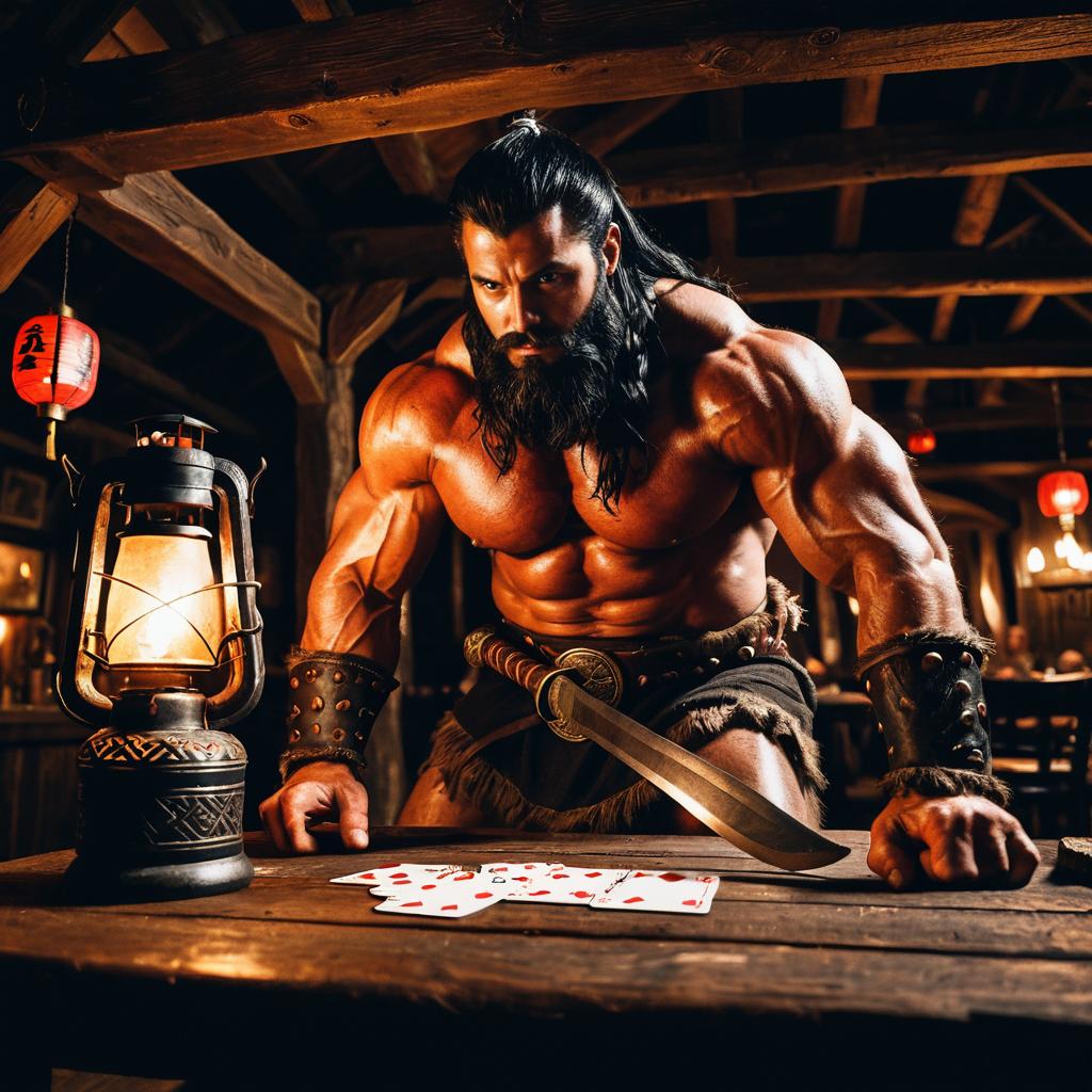 Close-up of a muscular barbarian warrior with black hair and beard, wearing wrist bracers and fur-trimmed clothing, leaning on a wooden table with playing cards spread out. The scene is illuminated by a flickering lantern and red hanging lanterns in a rustic wooden beam tavern.