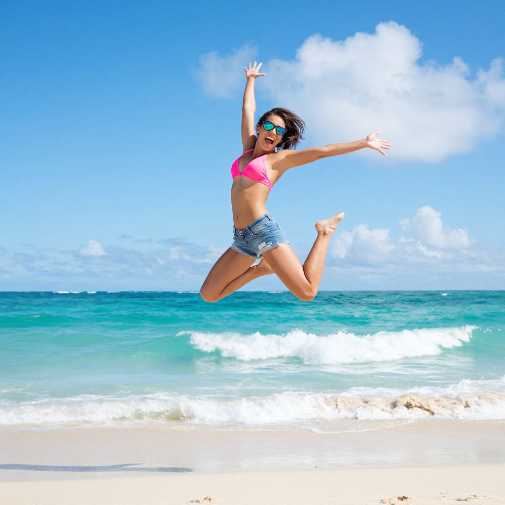 Photograph of a joyful woman in a bright pink bikini top and blue denim shorts, jumping mid-air on a sunny beach with turquoise waves and a clear