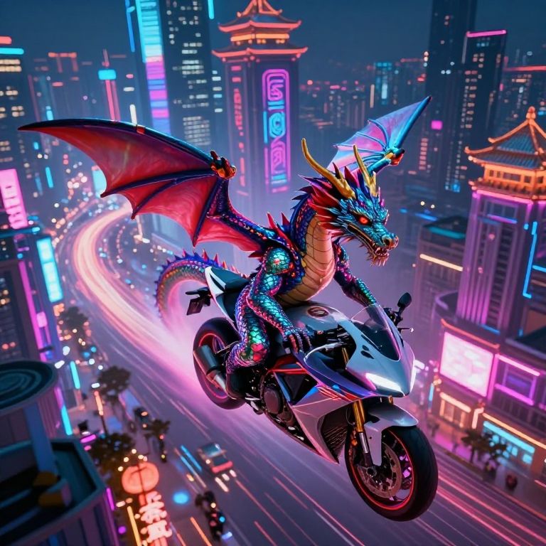 A vivid scene depicts a dragon astride a sleek motorcycle, weaving through a bustling futuristic cityscape bathed in neon lights at night. The dragon's iridescent scales catch the vibrant glow of towering skyscrapers adorned with intricate Chinese-inspired designs, creating an awe-inspiring fusion of mythical fantasy and cutting-edge technology. From an aerial viewpoint, witness the dragon's graceful maneuvering as it navigates the exhilarating urban landscape, its powerful wings tucked close to its body, blending seamlessly into the modern environment. This captivating imagery evokes a sense of wonder and amazement, showcasing the beauty and allure of a futuristic metropolis while highlighting the harmonious coexistence of mythical creatures and advanced machinery.