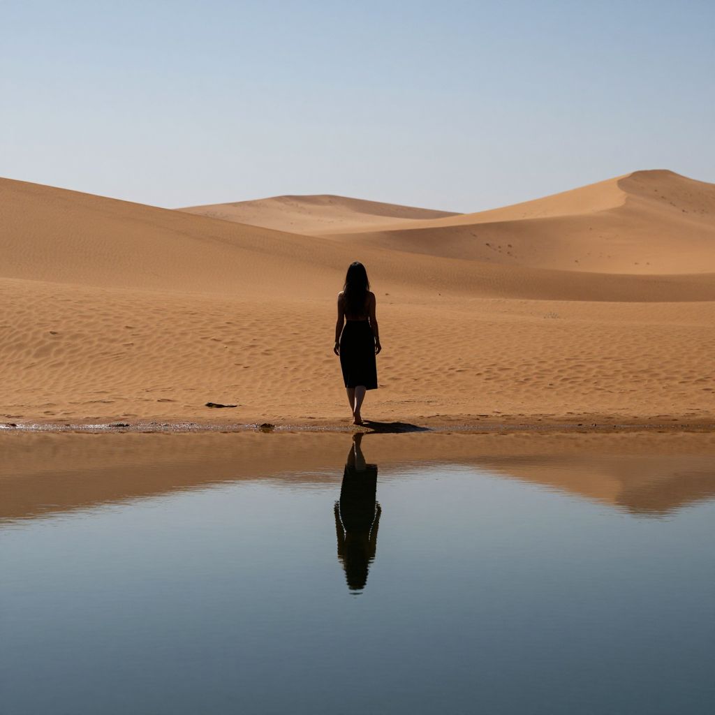Woman walking barefoot along a tranquil pool of water in a vast desert landscape, her silhouette reflected perfectly as she steps toward the horizon framed by towering sand dunes under a clear sky.