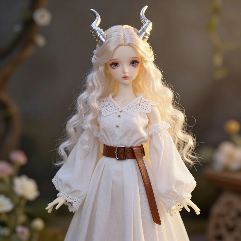 A beautiful female doll with delicate porcelain skin, large expressive eyes, and long flowing hair in soft waves, wearing a pristine white outfit with a flowing lace collar and long sleeves, a white skirt that drapes elegantly, and a brown leather belt that ties securely at the waist. She has elegant, slender features and a serene, almost mystical expression. Decorative silver horns rise gently from her head, shaped like spirals, glowing faintly with a soft golden hue. She stands in a quiet, moonlit garden, surrounded by blooming flowers and a soft glow of ambient light, exuding a sense of grace, mystery, and timeless beauty.
