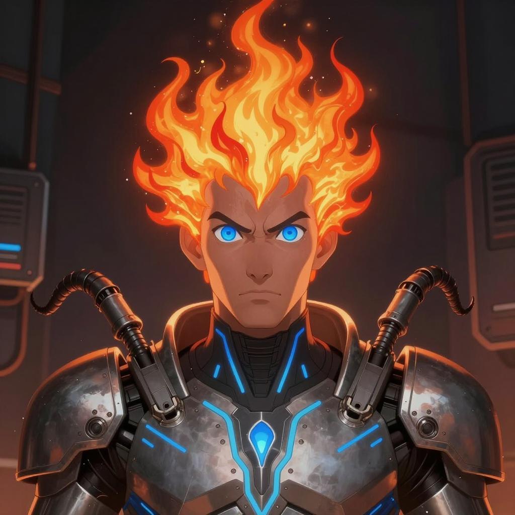 Digital illustration of a man with wide blue eyes, wearing a metallic, futuristic armor with blue glowing lines. His head is surrounded by orange and red flames, and black mechanical tendrils extend from behind his ears. Background features a dark, industrial setting with vertical cables and panels. Man's expression is intense and focused.