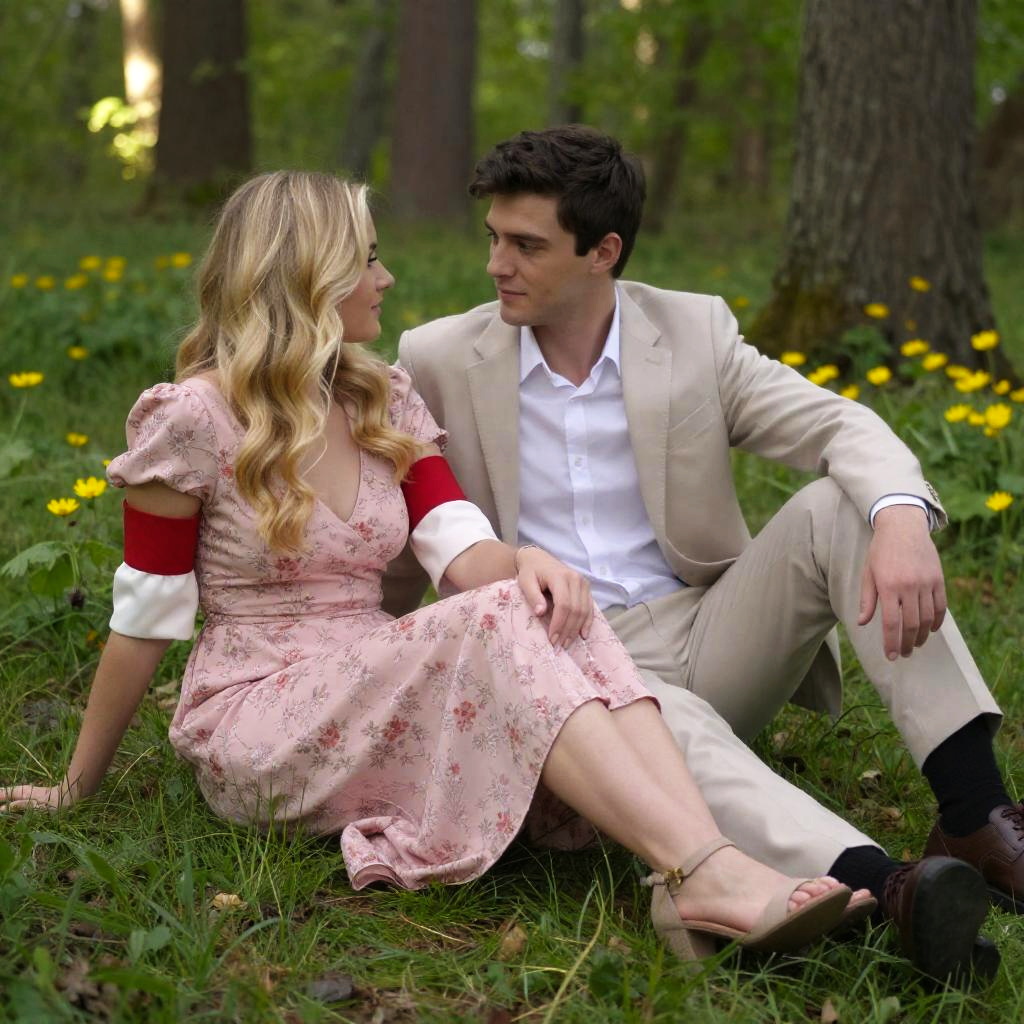 Photograph of a couple sitting on a mossy forest floor. Young man with short brown hair in blue hoodie, young woman with long blonde hair in blue polka dot dress. Both smiling, leaning towards each other. Green foliage and sunlight in background. Woman's arm around man's waist, man's arm around her back.