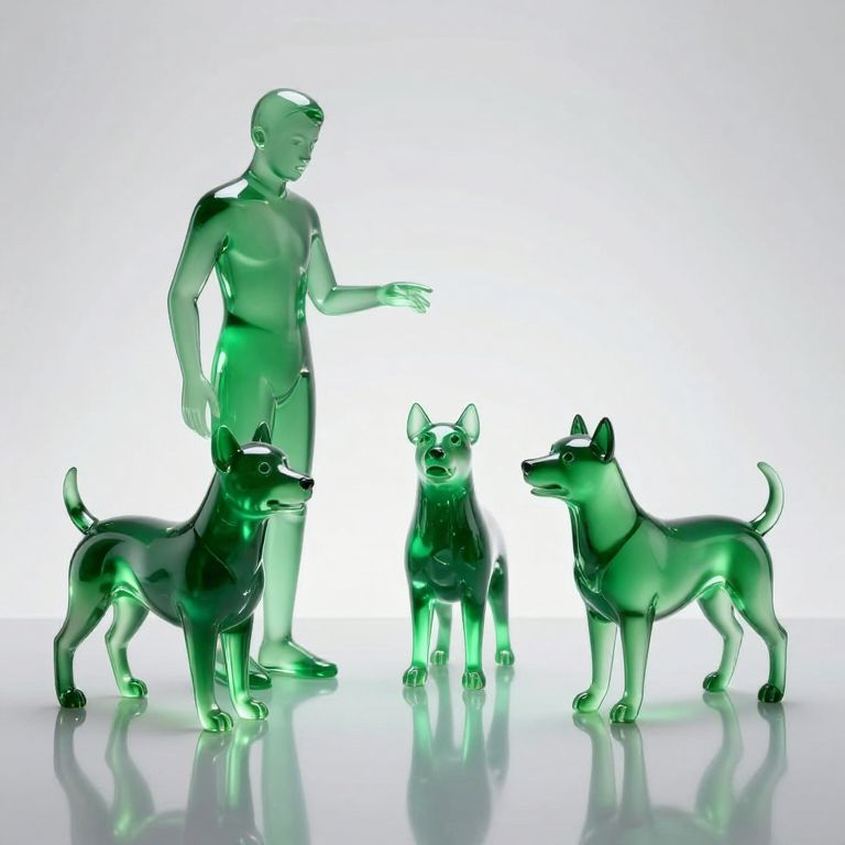 Luminous green glass sculptures depict a humanoid figure gesturing toward three canine companions, all rendered in translucent, reflective material, creating a surreal scene of interaction on a smooth, reflective surface.
