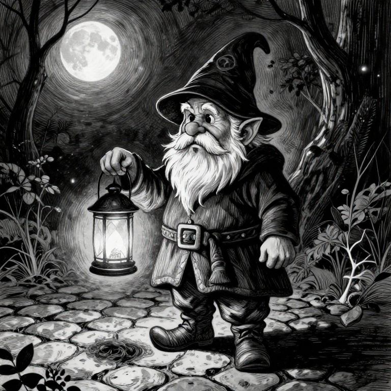 Black and white gnome with a long beard and pointed hat, holding a lantern, standing on cobblestone path under moonlight, dramatic lighting and shadows, fine ink drawing style, old fantasy book illustration aesthetic, atmospheric and moody.