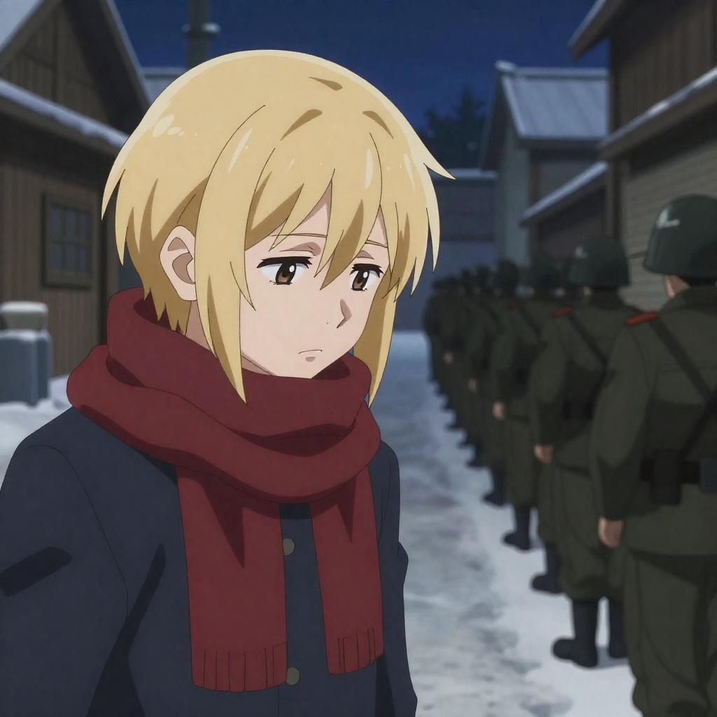 Digital anime-style illustration of a blonde-haired character with a red scarf, looking nervously down a snowy, dark street lined with soldiers in uniforms and helmets. The background features wooden buildings and a blue, moonlit sky. The character is on the left, soldiers on the right.