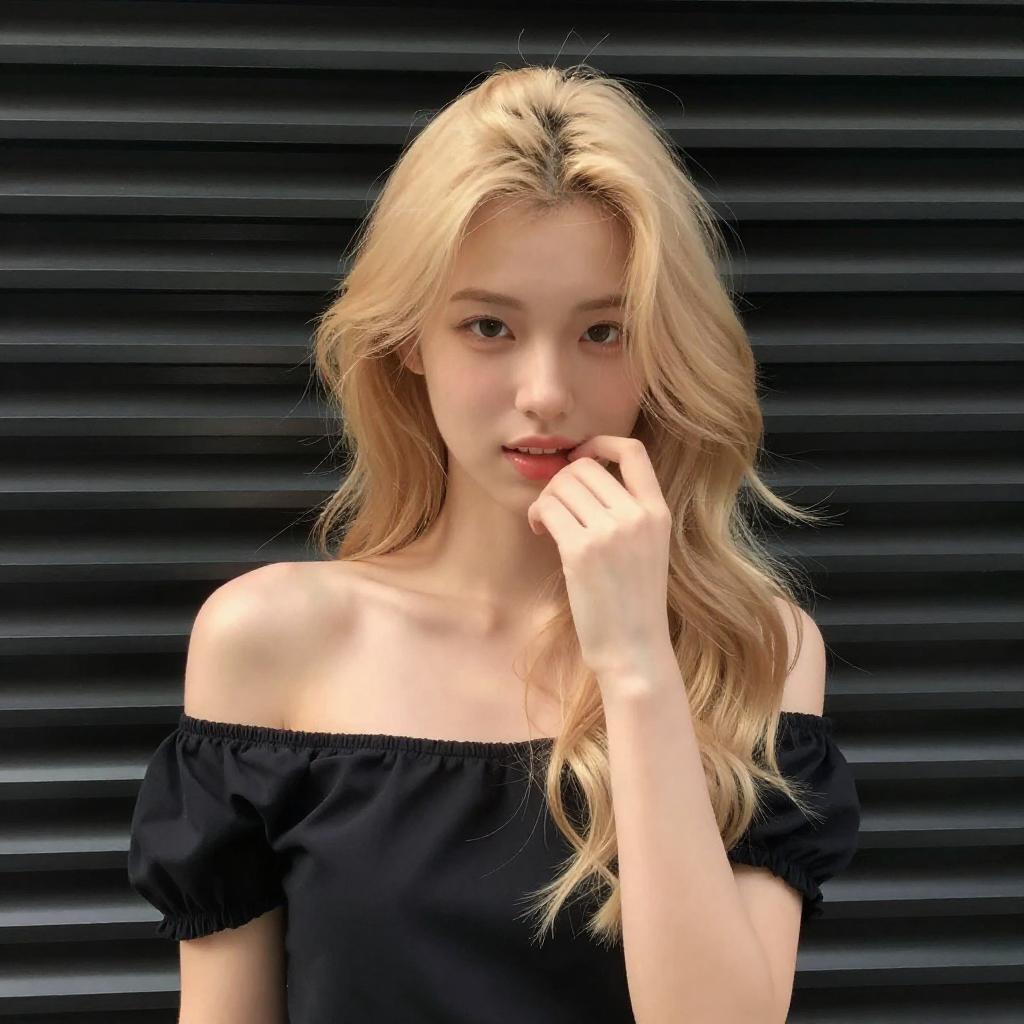 Photograph of a young woman with wavy, blonde hair and fair skin, wearing an off-the-shoulder black top. She gazes at the camera with a slight smile, her right hand touching her lips. She stands in front of a black slatted wall, with soft, warm lighting highlighting her hair and face.
