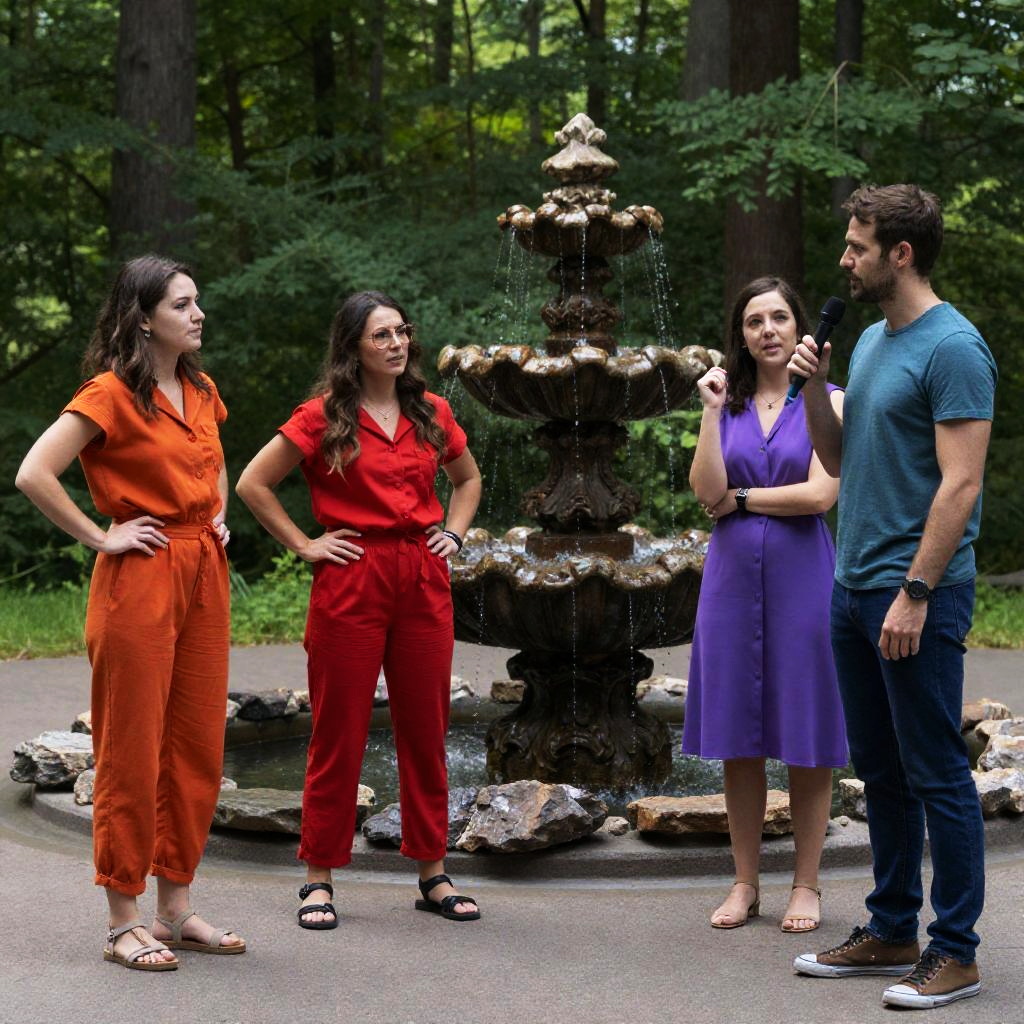 Photograph of four people in a forest. Three women, one in an orange outfit, one in a red outfit, and one in a purple dress, stand with hands on hips. One man in a blue shirt and jeans holds a microphone, speaking. Brown-haired man in green shirt and brown pants listens. Rocky fountain in center. Dense green foliage in background.