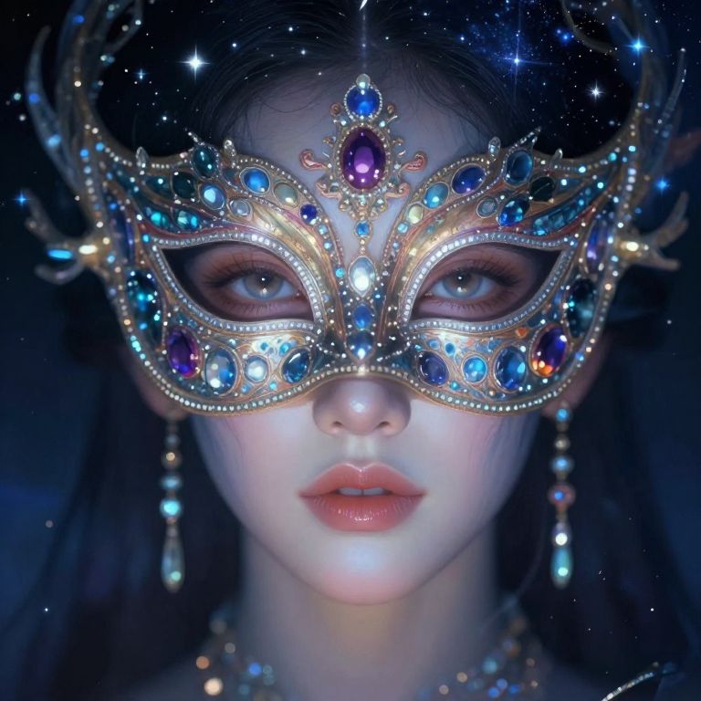 A digital artwork of an Asian woman with fair skin and delicate features, wearing an ornate masquerade mask. The mask is intricately adorned with sparkling blue, purple, and gold jewels, and has a celestial theme with star-like accents. Her dark hair is partially visible, and she wears dangling earrings that match the mask's jewels. Her eyes are large and expressive, with a slight gaze directed forward. The background is a deep blue, enhancing the mask's luminous details. Her lips are slightly parted, showing a subtle, natural pink hue. The overall style is highly detailed and ethereal.