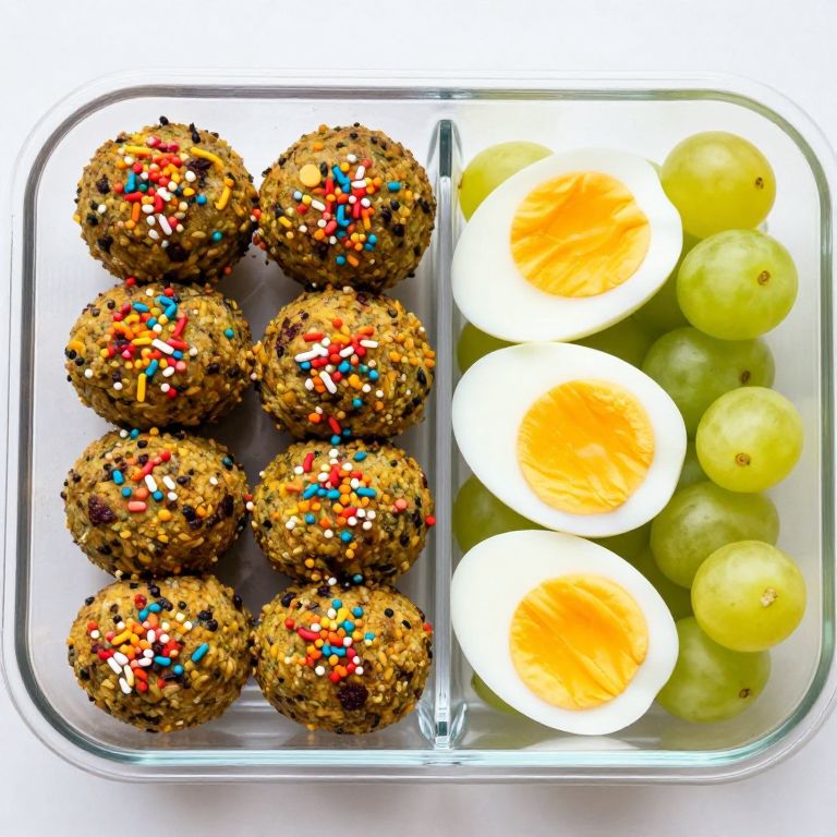 Organic bento box featuring six round, colorful falafel balls topped with vibrant sprinkles in the left compartment, alongside three neatly halved hard-boiled eggs surrounded by a mix of green and yellow grapes in the right compartment, showcasing a nutritious and visually appealing vegan lunch option.