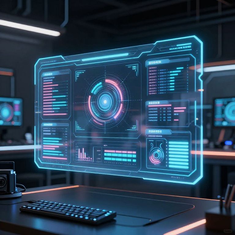 This digital CGI image depicts a futuristic, high-tech control room with a glowing holographic interface floating in front of a dark, industrial background. The hologram features neon blue and pink lines, with a central circular display and multiple data panels. Below the hologram, a black keyboard rests on a sleek, dark desk. Flanking the main hologram are two smaller screens displaying similar data. The room is dimly lit with neon light strips, emphasizing the high-tech, sci-fi atmosphere. The overall color scheme includes dark blues, blacks, and neon pinks and blues.
