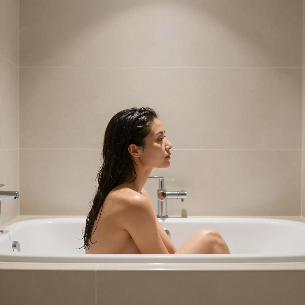 Group of five people in a luxurious bathroom. A woman in a white dress leans over a steaming jacuzzi, hands in water. Four people, including a blonde woman and a man with long hair, sit in the jacuzzi. Candles on jacuzzi edge, two statues of angels on right. Green plants in background, large window with curtains. Warm, soft lighting.