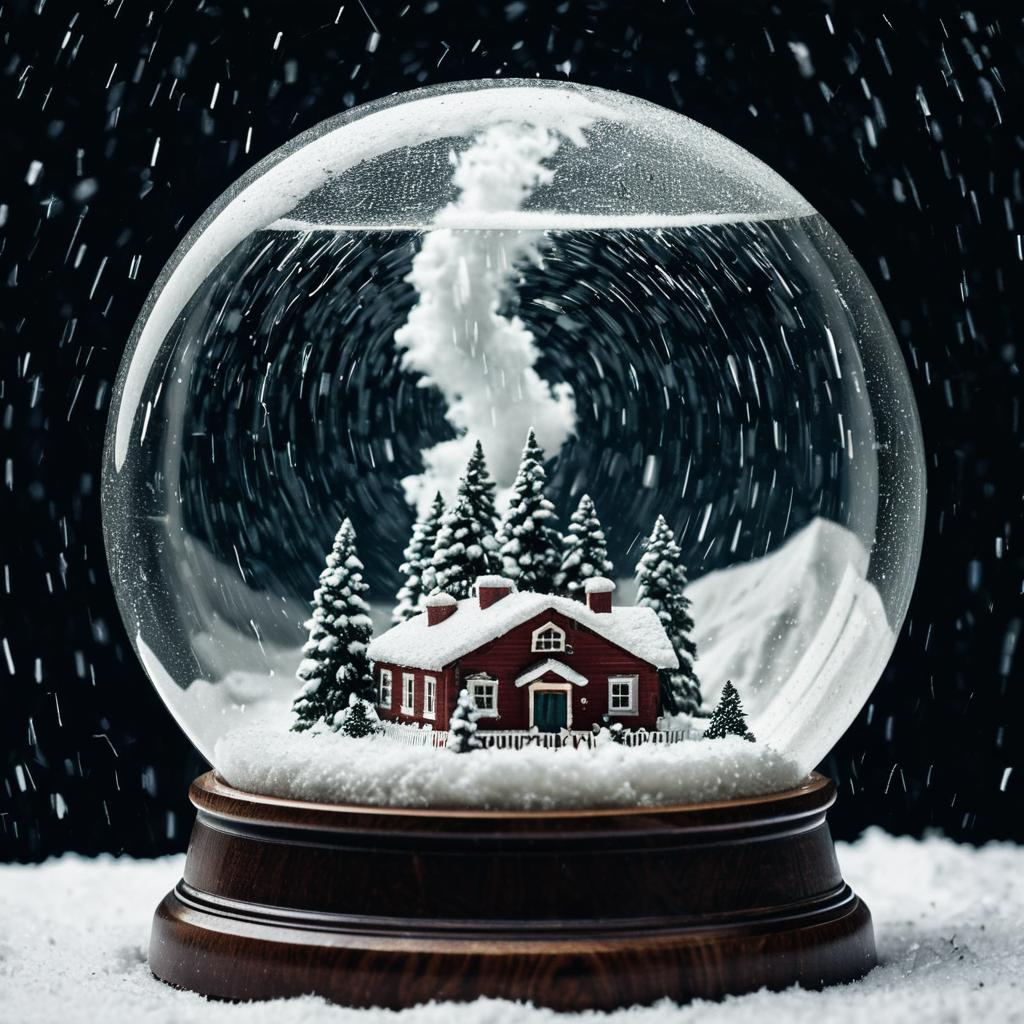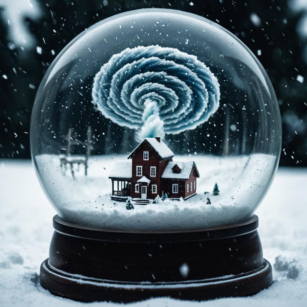 Tornado spiral inside a snow globe, cinematic style with motion blur