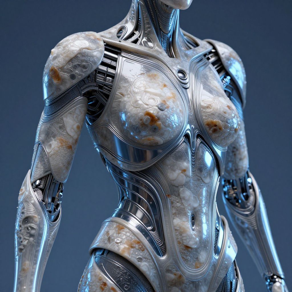 This is a highly detailed, CGI-rendered image of a futuristic, humanoid robot with a female physique. The robot's metallic body features a glossy, silver exterior with intricate, wave-like patterns and circuitry lines. Its chest area has prominent, textured, breast-like structures with visible brownish spots, suggesting wear or damage. The arms and torso are sleek and streamlined, with a mix of smooth and textured surfaces. The background is a solid, deep blue, creating a stark contrast with the robot's shiny, metallic appearance. The overall style is hyper-realistic, emphasizing the blend of organic and mechanical elements.