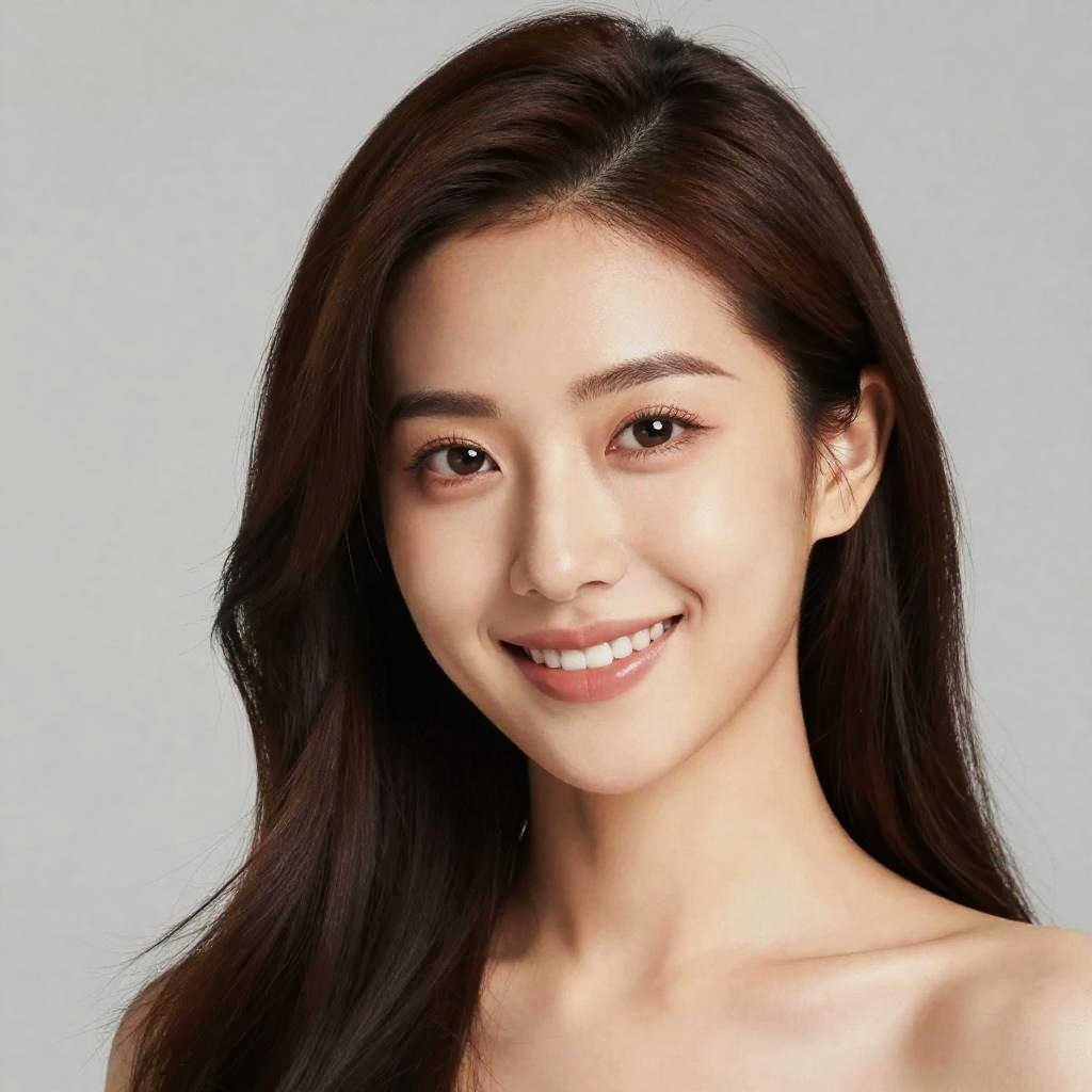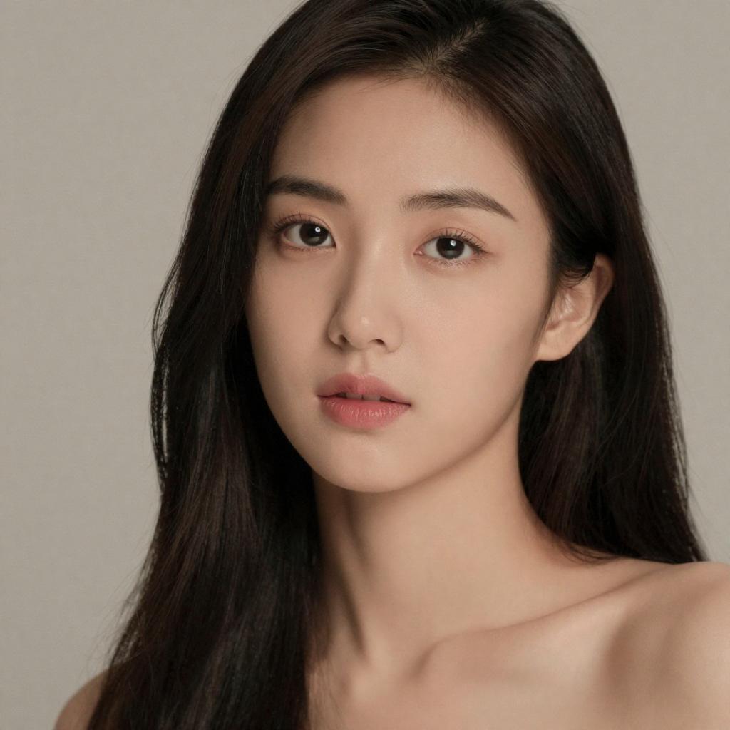 Photograph of an East Asian woman with smooth, fair skin and soft, natural light highlighting her face. She has long, slightly wavy black hair partially covering her left ear, and her brown eyes are looking upwards with a serene expression. Her lips are slightly parted, showing a hint of pink. The background is a simple, light gray, keeping the focus on her profile.