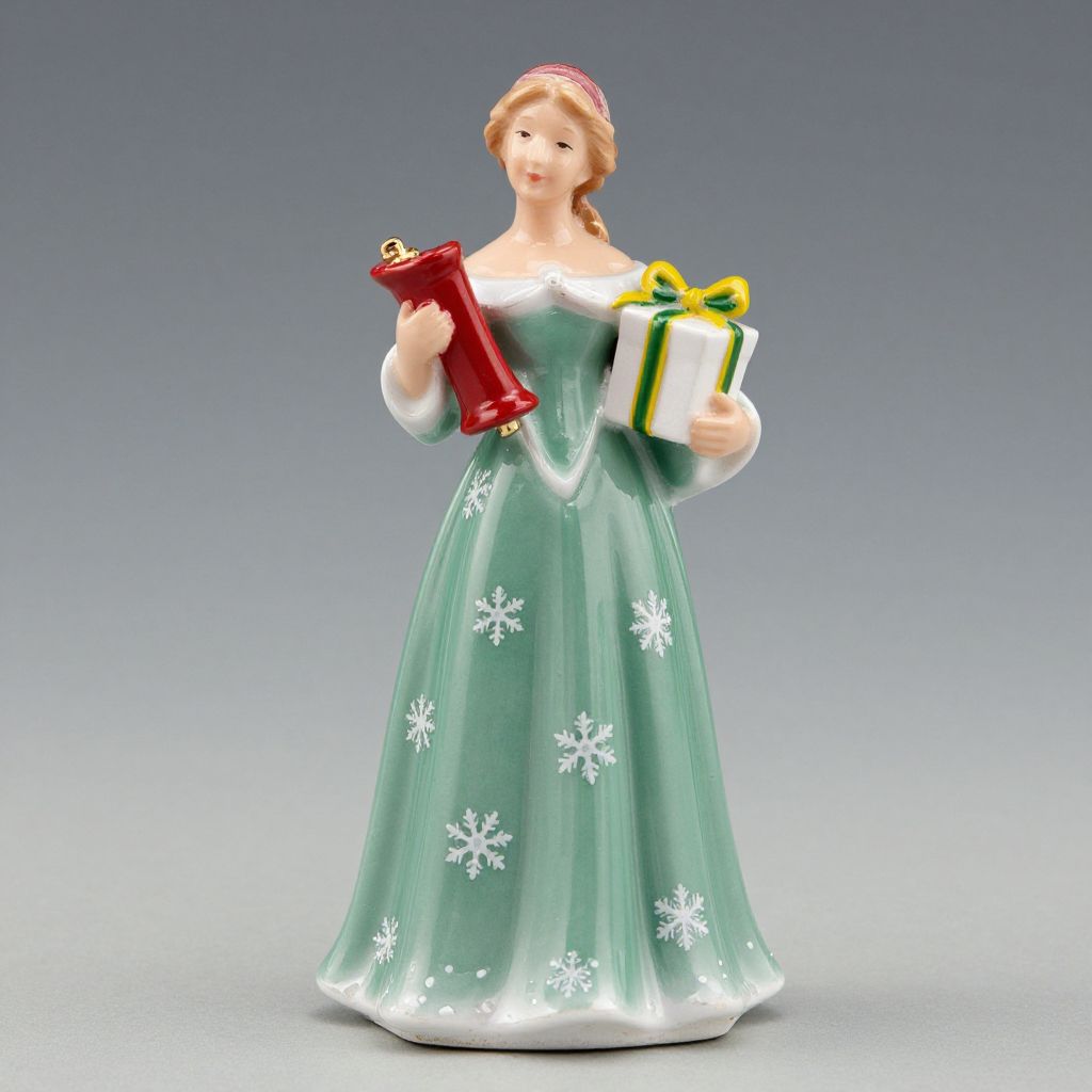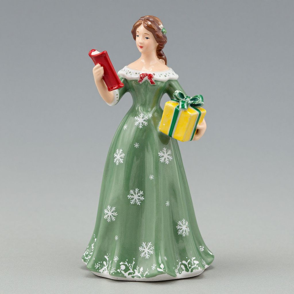 Elegant figurine of a woman dressed in a green gown adorned with white snowflake patterns, holding a red scroll in her right hand and a gift box decorated with yellow and green ribbons in her left, embodying the 4th Day of Christmas theme as part of the Royal Doulton collection.
