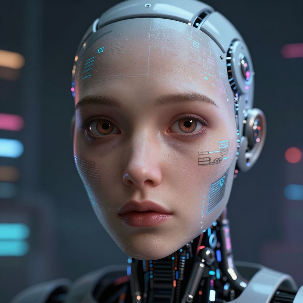 AI clothes off futuristic portrait, half-dressed artificial intelligence character blending human and machine features, digital fabric evaporating into light particles, background of a neon-lit urban skyline at night, detailed cybernetic enhancements and expressive eyes