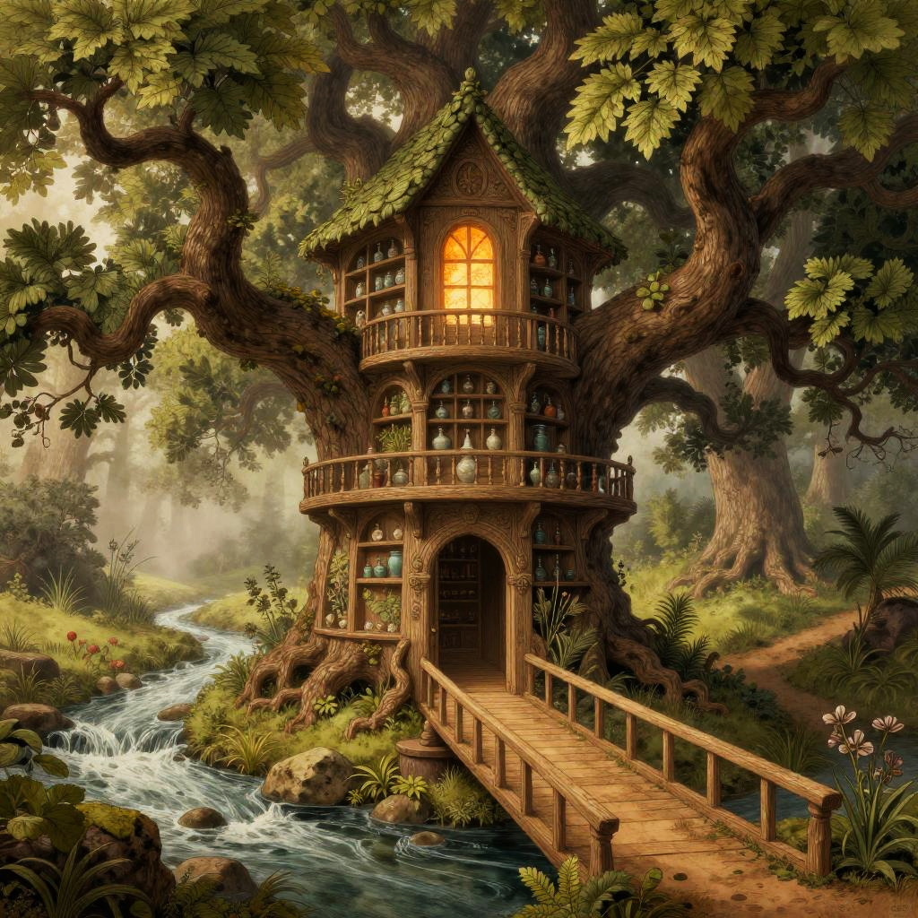 Anton Pieck style illustration of a multilevel apothecary and herbarium carved into an ancient oak tree, large continuous tree, leafy roof, inviting entrance with bridge, connected paths, in a mist-laced medicinal grove beside a meandering stream, flowing stream, waterfall, vintage paper texture, intricate line work, high detail, mystical atmosphere, warm and nostalgic tones, soft lighting, high quality, warm window lighting