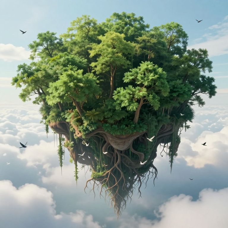 Digital artwork of a floating island tree with lush green foliage, exposed roots, and birds flying around, set against a bright blue sky with fluffy clouds.
