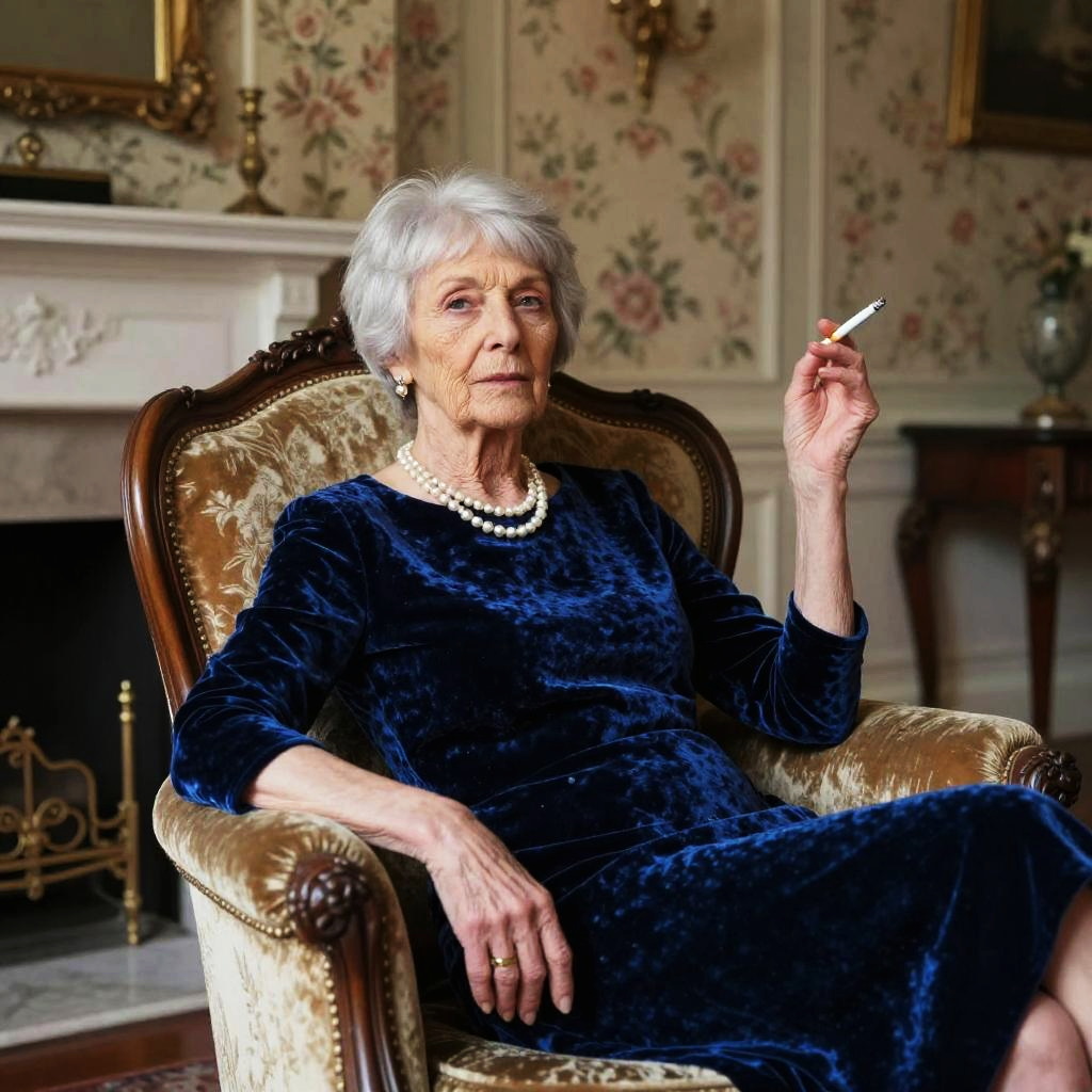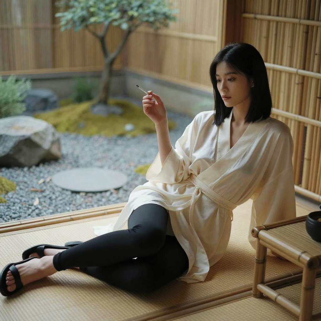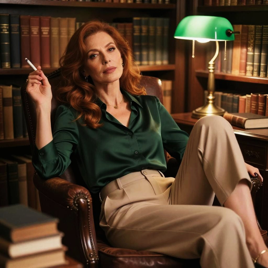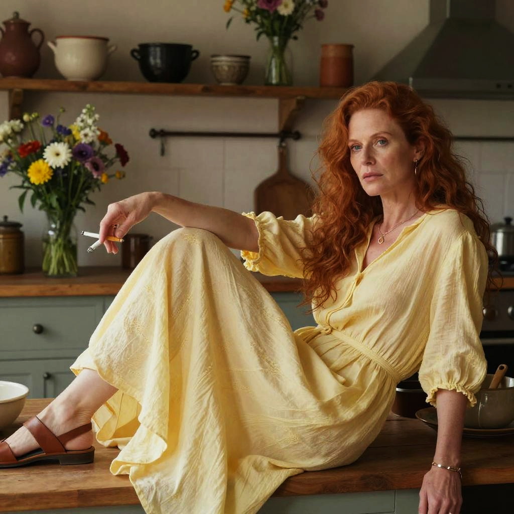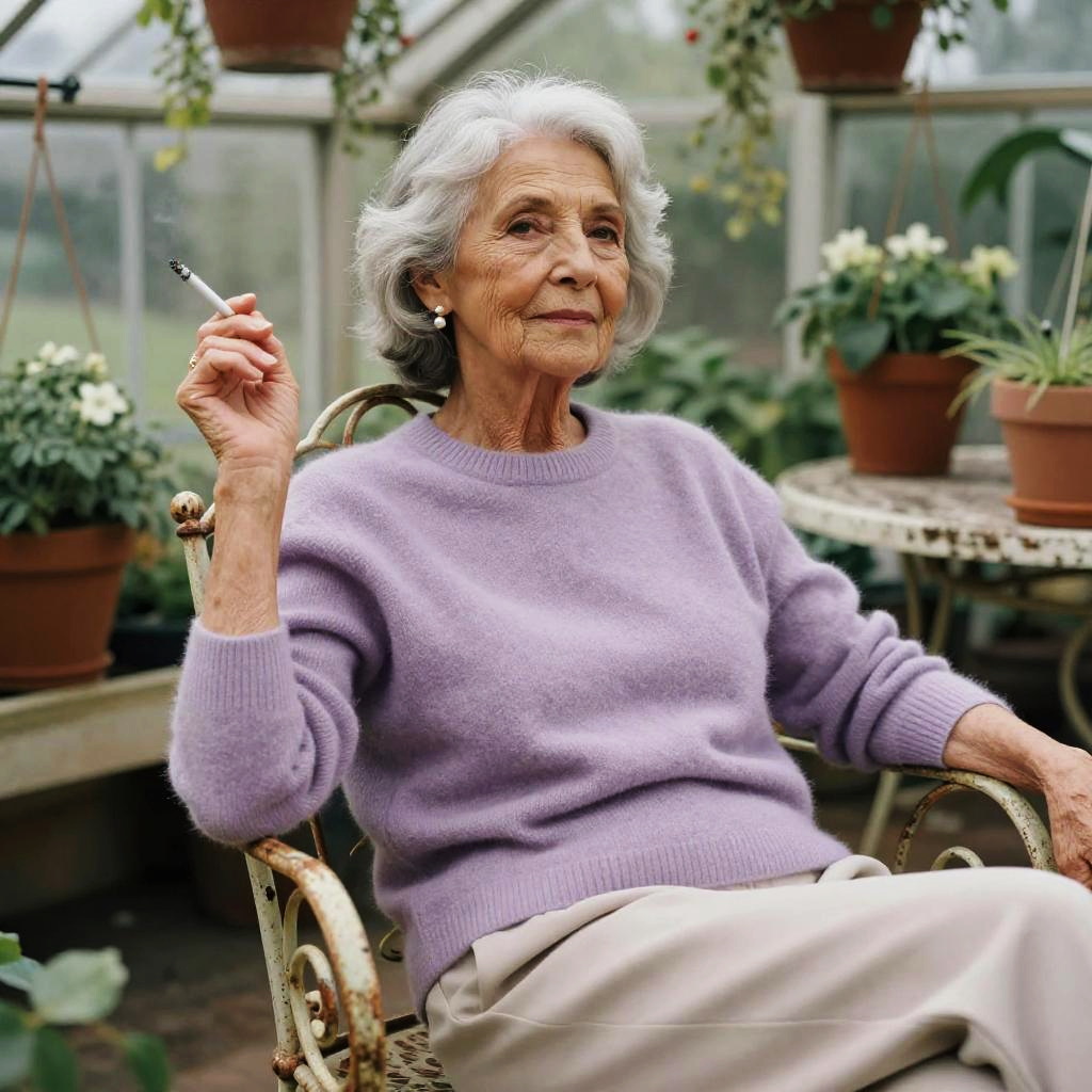 Fine-art editorial photograph, photoreal SDXL: elegant young white woman with pale freckled skin and long sun-kissed wavy Auburn hair reclining in a charming rustic greenhouse filled with cascading ivy and terracotta pots, styled in a cream lace blouse paired with high-rise wide-leg jeans and tan leather loafers. No nudity. Right hand holds an unlit cigarette, gaze calm and assured. Subtle film grain, shallow depth of field, warm ambient glow, high detail, intimate yet tasteful.
