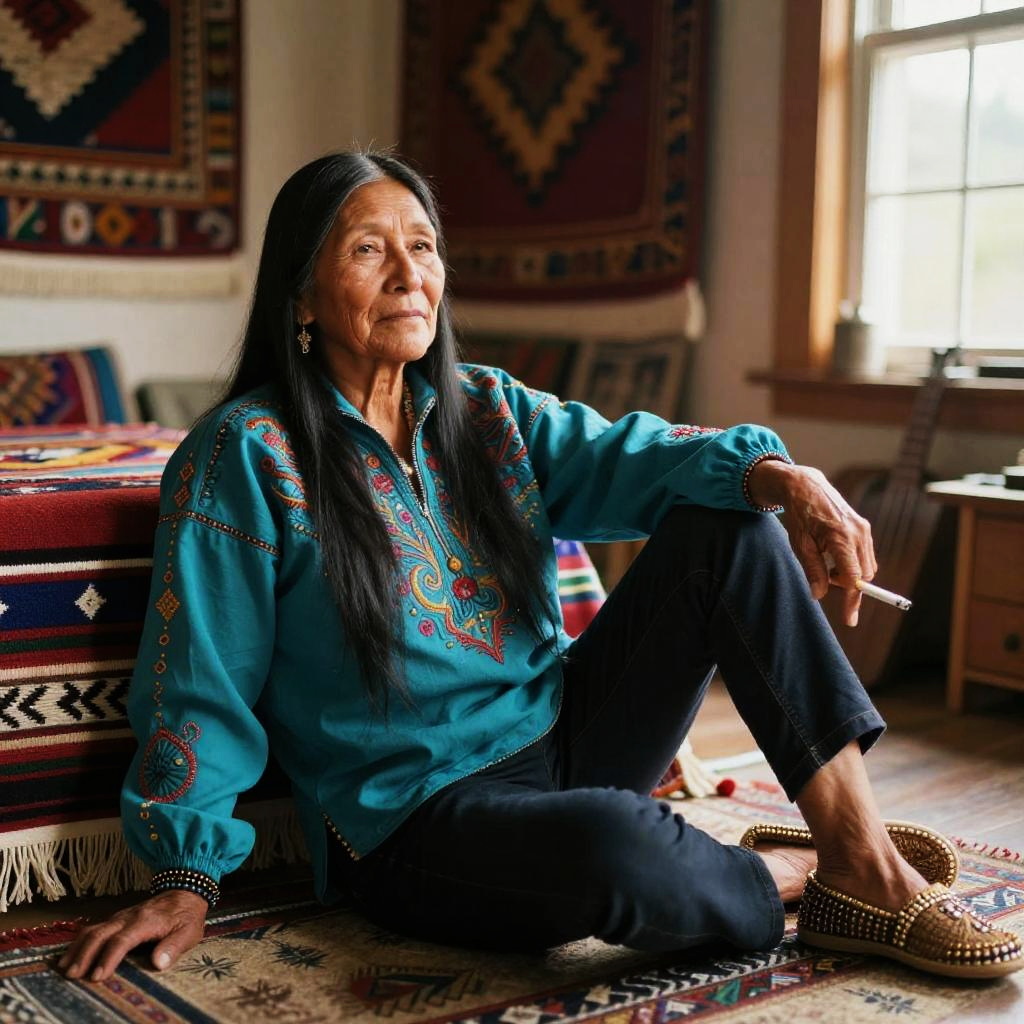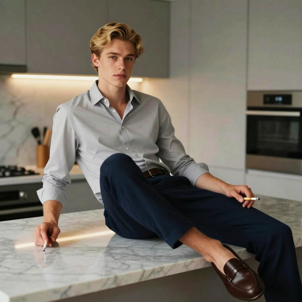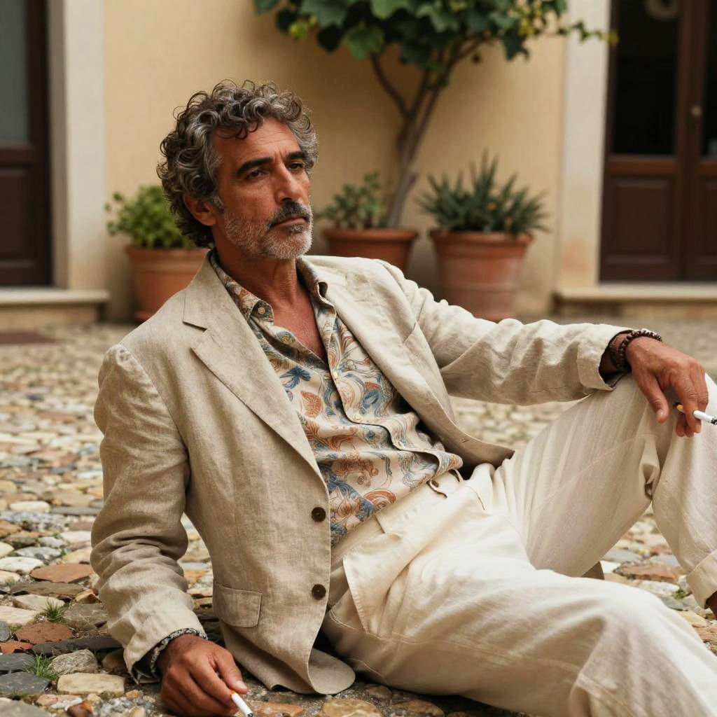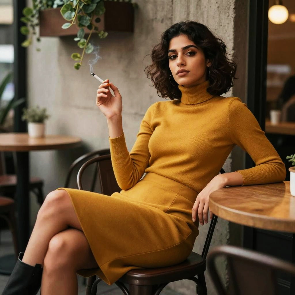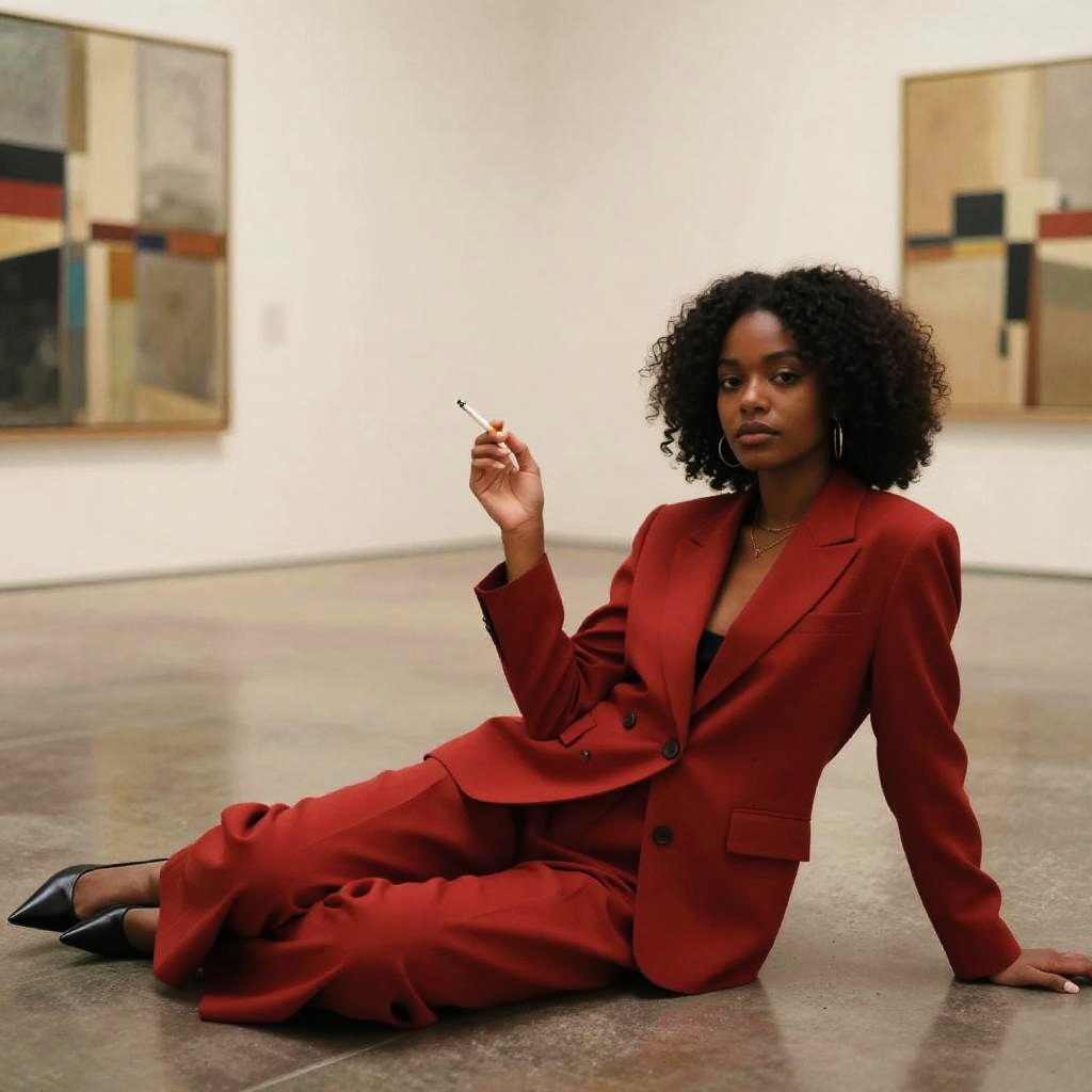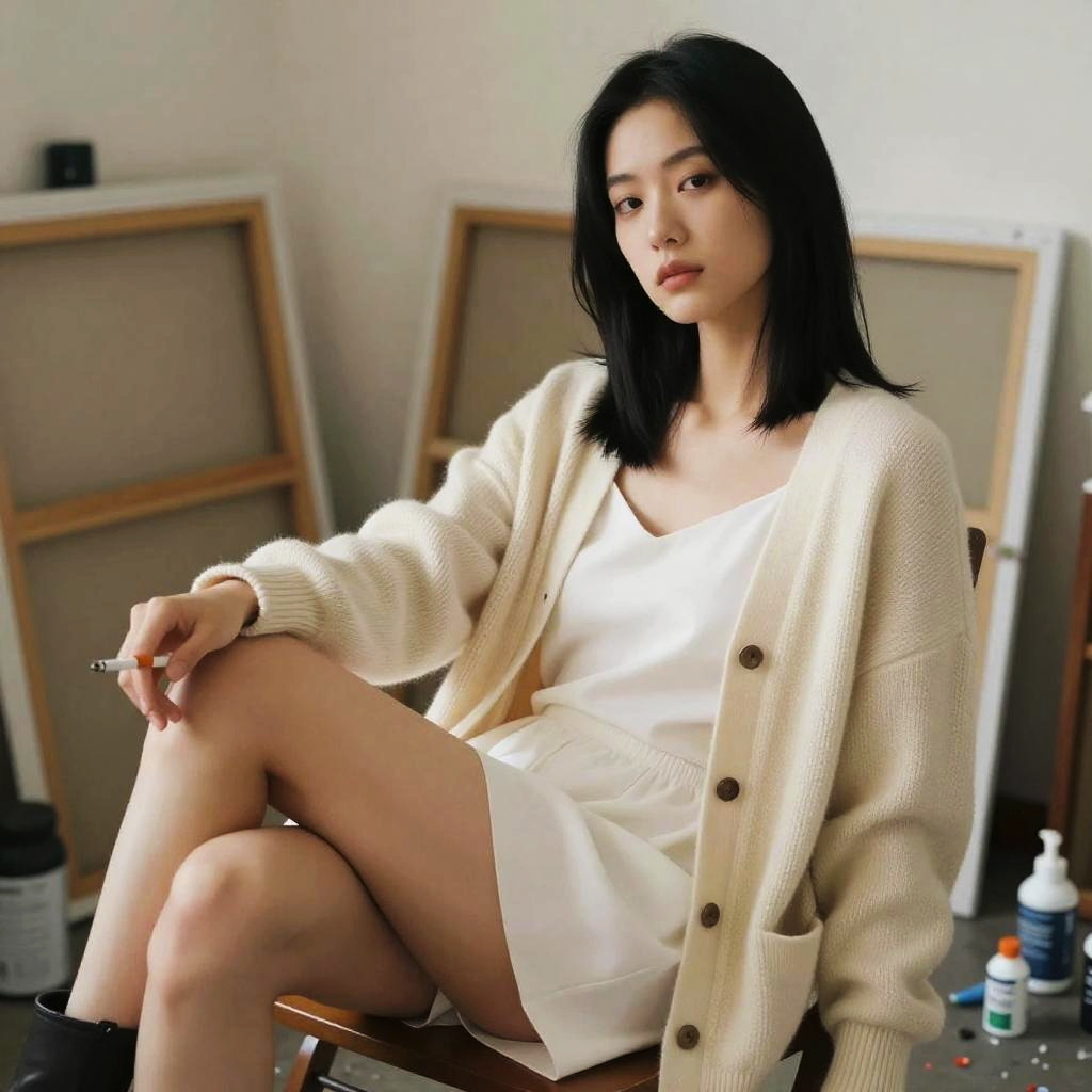 Fine-art editorial photograph, photoreal SDXL: elegant young white woman with pale freckled skin and long sun-kissed wavy Auburn hair reclining in a charming rustic greenhouse filled with cascading ivy and terracotta pots, styled in a cream lace blouse paired with high-rise wide-leg jeans and tan leather loafers. No nudity. Right hand holds an unlit cigarette, gaze calm and assured. Subtle film grain, shallow depth of field, warm ambient glow, high detail, intimate yet tasteful.