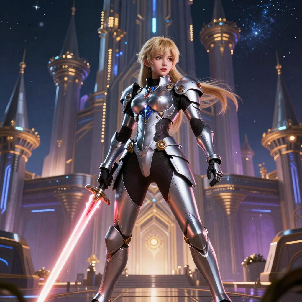 Realistic photo.a daring space princess, wearing sleek sci-fi armor, holding a laser sword, set in a grand cosmic castle, drawn in the sci-fi-inspired yet fantastical style of Hiro Mashima. realistic photo