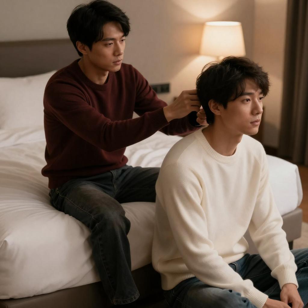 Photograph of two Asian men in a dimly lit bedroom. The man in the maroon sweater sits on the bed, gently gripping the other man's hair with his right hand. The man in the white sweater kneels on the floor, facing right. Bed with white sheets and pillow in background. Warm bedside lamp on right. Both men have short dark hair. Intense facial expressions.